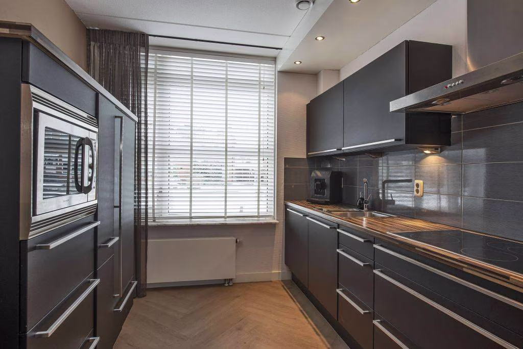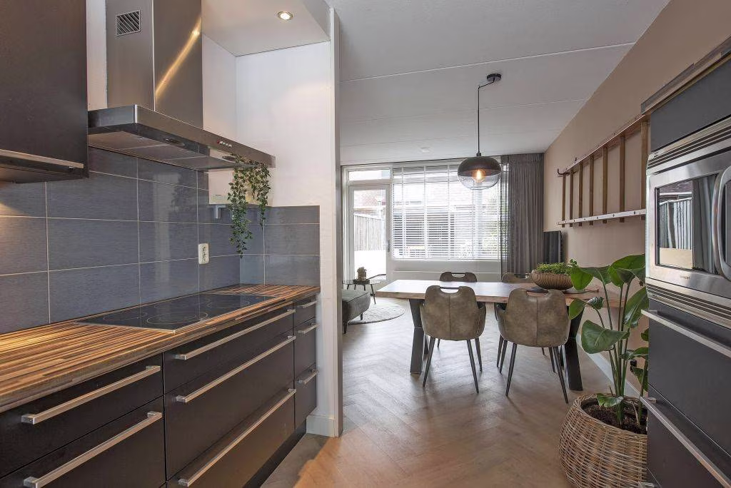 - Open keuken v.v. keramische kookplaat, afzuiging, koel-vriescombinatie, combi-magnetron en vaatwasser;