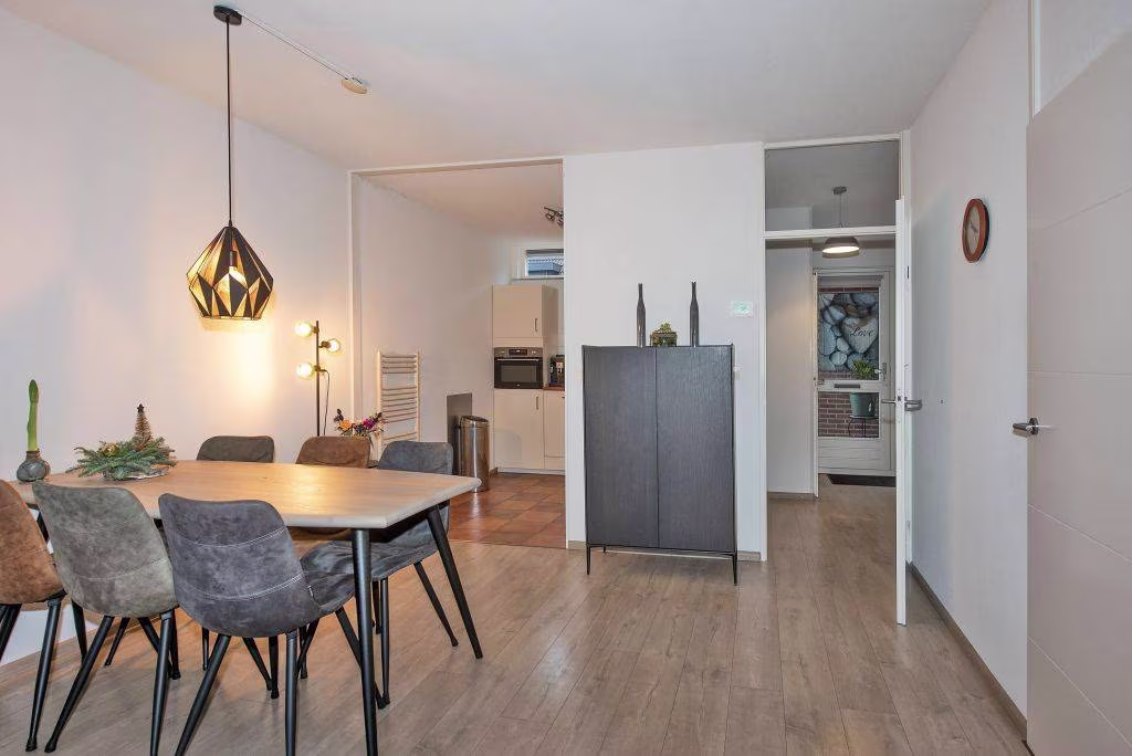 Via de entree stap je binnen in een verzorgde hal die direct een prettige indruk geeft. Hier vind je de trapopgang, toilet, meterkast en toegang tot de woonkamer. De woonkamer is een aangename leefruimte waar daglicht volop binnenvalt. Er is voldoende plaats voor een comfortabele zithoek en een gezellige eethoek, waardoor dit een fijne plek is voor zowel ontspannen momenten als samenzijn met familie en vrienden. De verbinding met de keuken zorgt voor een natuurlijke samenhang tussen de ruimtes en maakt het geheel praktisch en prettig in gebruik.