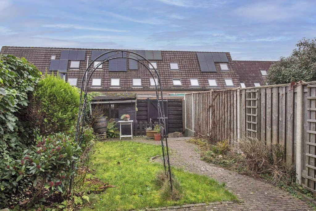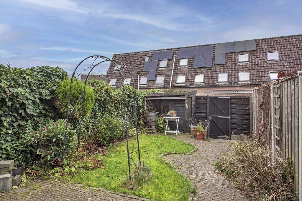 De tuin is groen aangelegd en praktisch ingedeeld. Je vindt hier een gazon, een terras waar je fijn kunt zitten en een handige berging voor fietsen en tuinspullen. Dankzij de achterom is de tuin ook goed bereikbaar, wat het dagelijks gebruik extra prettig maakt.
