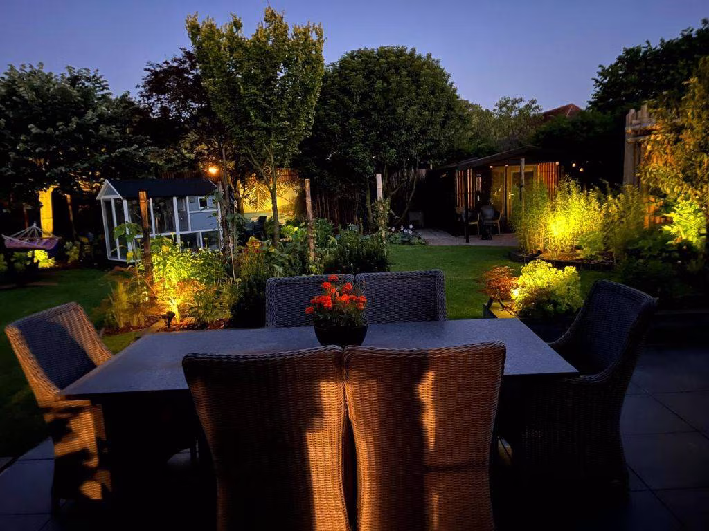 Via de elektrische toegangspoort rijd je de ruime oprit op. Hier geniet je van een royaal terras, een tuinhuis/berging met elektra en een aparte houtopslag. Onder de heerlijke overkapping kunt u tot laat in de avond zitten met uitzicht op een prachtig aangelichte tuin. Ook is er een fraai kippenhok aanwezig in uw tuin, dus elke ochtend een heerlijk vers eitje!