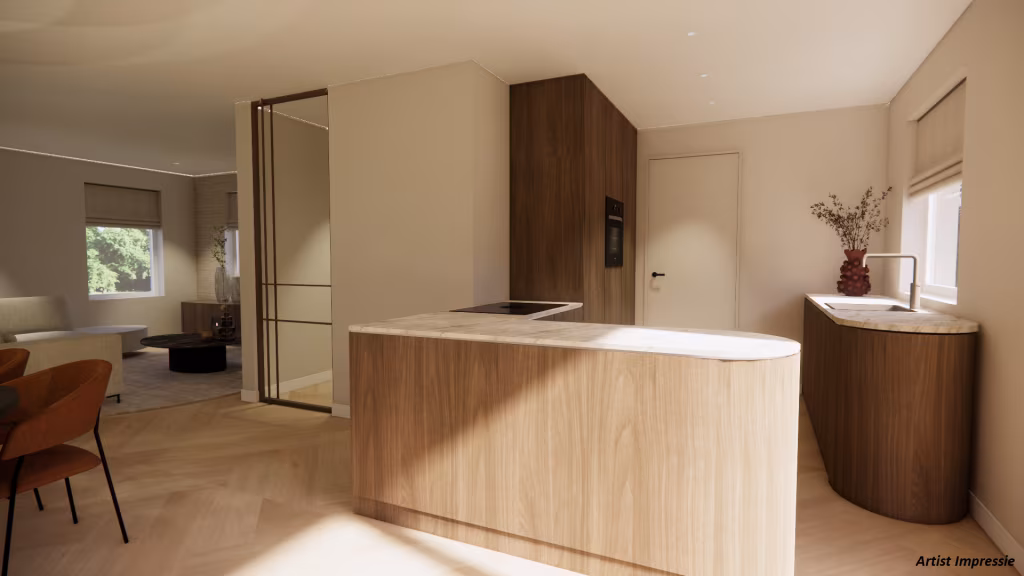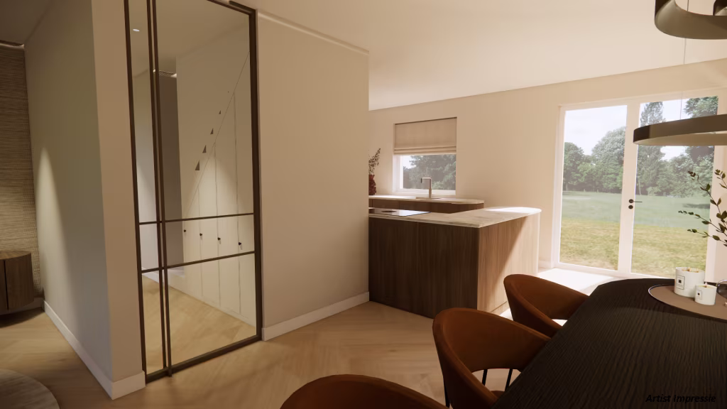 Aansluitend bevindt zich de bijkeuken, waar ruimte is voor de wasmachine en droger. Vanuit hier is er een doorgang naar de inpandige garage, ideaal voor het stallen van fietsen, een auto of als extra opslagruimte.