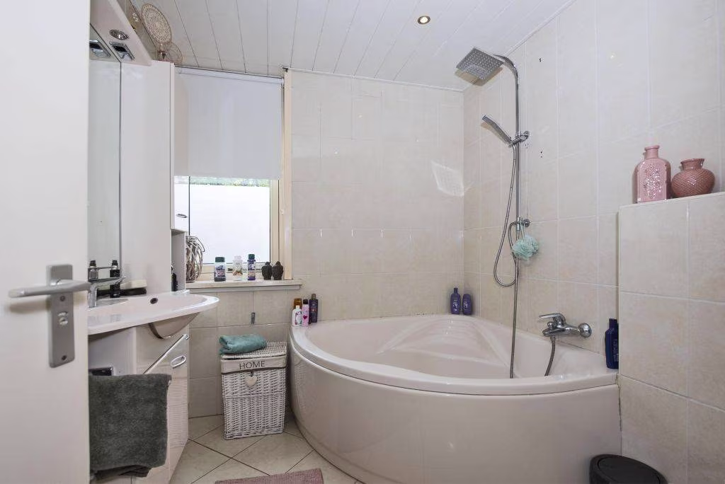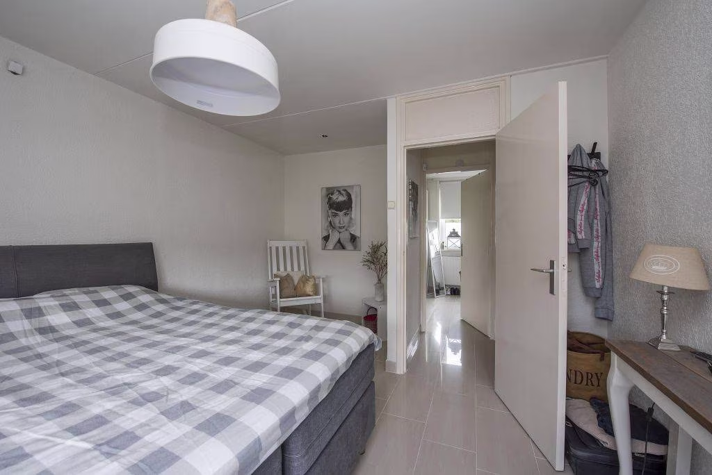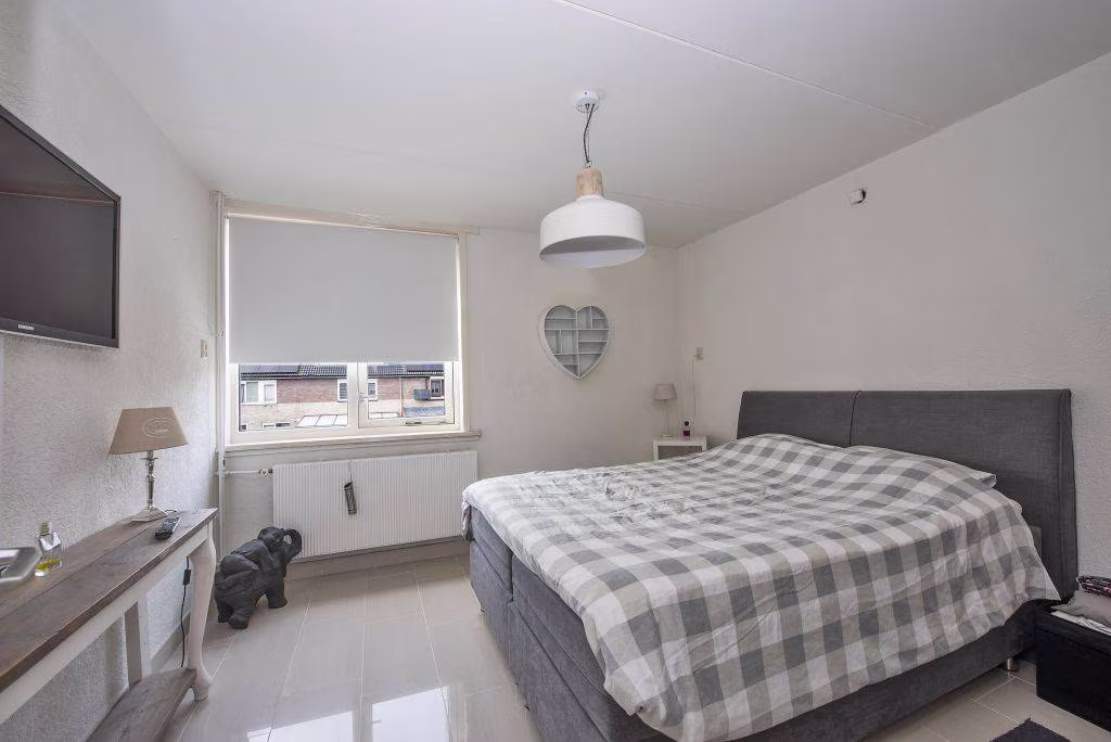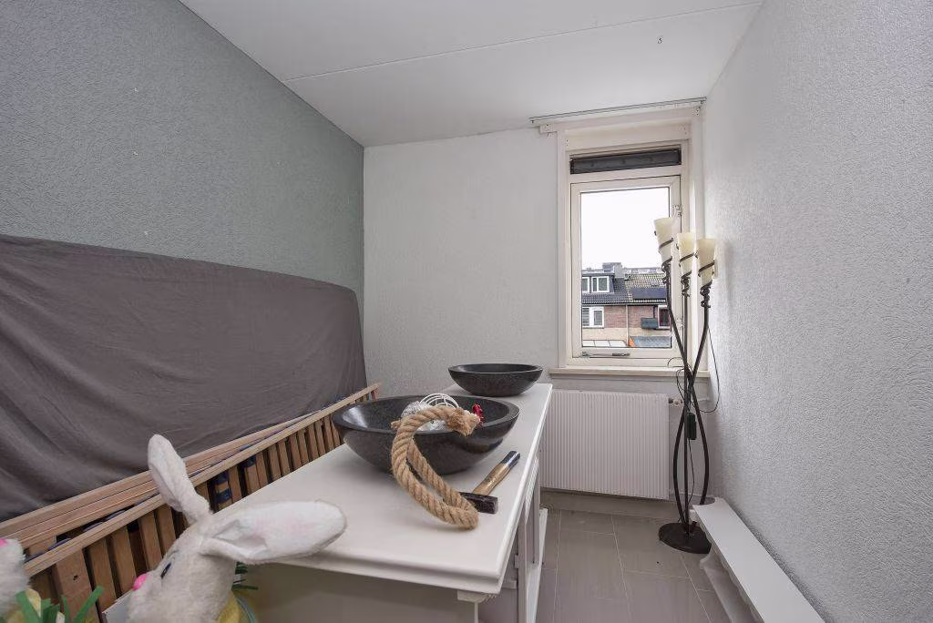 Op de eerste verdieping vind je drie fijne slaapkamers en een nette badkamer. De hoofdslaapkamer, gelegen aan de achterzijde, is ruim opgezet en biedt meer dan genoeg plek voor een groot bed en een royale kast. Door het brede raam valt veel natuurlijk licht naar binnen, wat de kamer een rustige en ontspannen sfeer geeft. Aan de voorzijde ligt een tweede slaapkamer, momenteel in gebruik als kleed en werkruimte, maar ook uitstekend geschikt als kinderkamer of logeerkamer. De derde kamer is compacter en kan goed worden ingericht als bijvoorbeeld een hobbyruimte of thuiskantoor. De badkamer is volledig betegeld en uitgerust met een hoekbad met douchefunctie, wastafelmeubel en toilet. Dankzij het raam geniet je hier van daglicht en natuurlijke ventilatie.