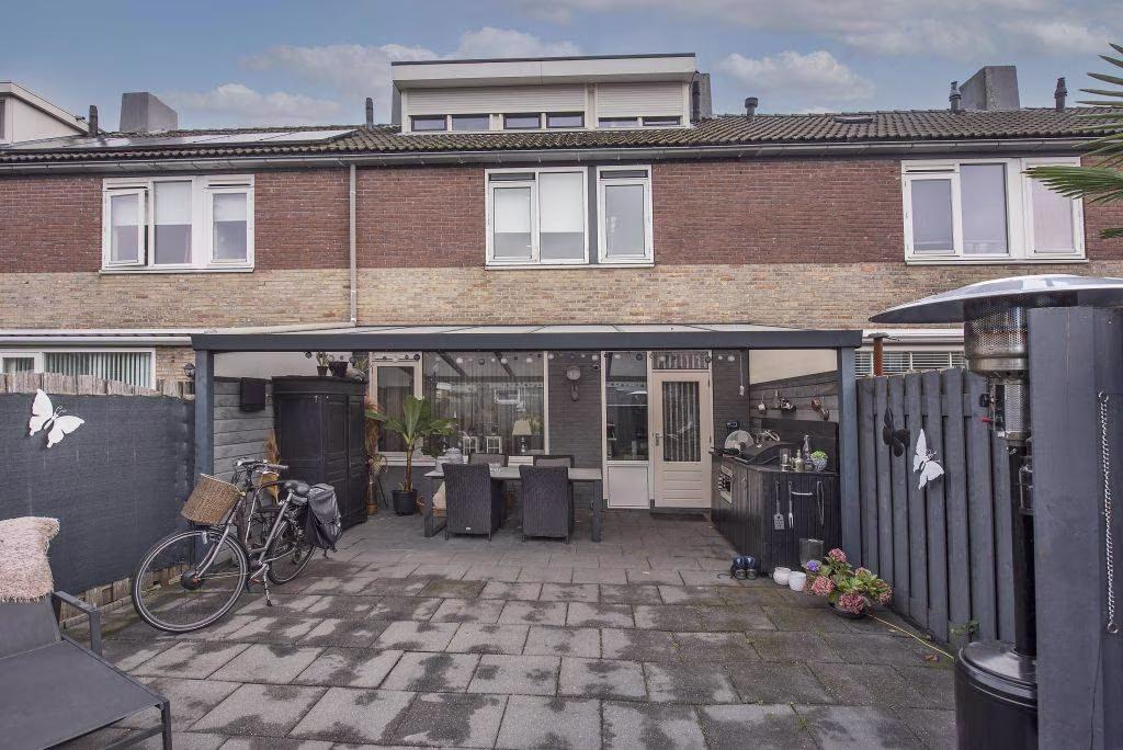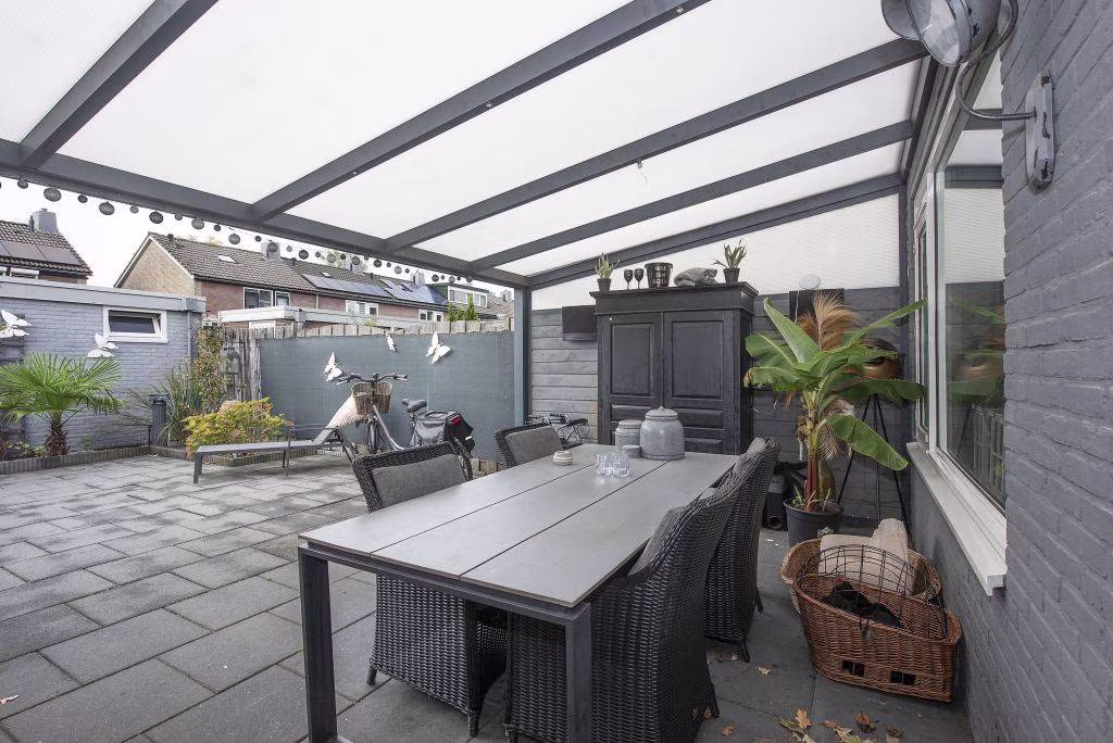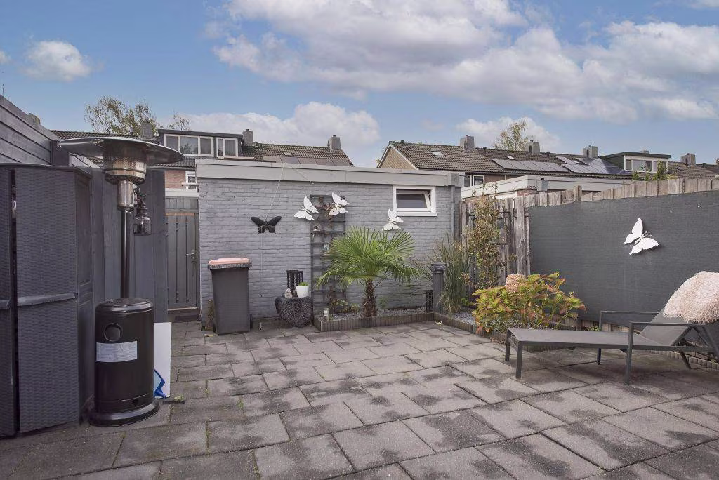 De tuin is een heerlijke plek om te ontspannen, strak, verzorgd en helemaal gericht op praktisch comfort. De tuin is grotendeels bestraat, waardoor onderhoud minimaal is, maar dankzij de plantenbakken en decoratieve accenten toch een sfeervolle uitstraling heeft. De grote overkapping zorgt ervoor dat je hier het hele jaar door kunt genieten, of het nu is voor een kop koffie in de ochtendzon of een gezellige barbecue met vrienden in de avond. Achter in de tuin staat een stenen berging, ideaal voor het opbergen van fietsen, tuingereedschap of seizoens spullen. Via de achterzijde is de tuin bovendien ook gemakkelijk te bereiken. Een fijne, beschutte buiten plek met veel comfort en gezelligheid.