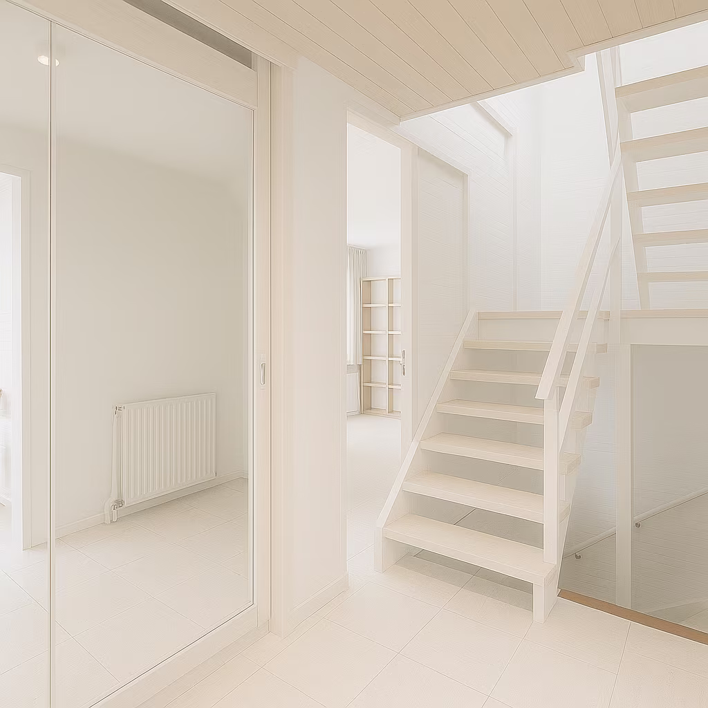 1e verdieping: Via het trappenhuis met steeds trappen van 7 treden komt u op de 1e verdieping. Hier vinden we de eerste twee ruime slaapkamers waarvan op de achterste slaapkamer een wastafel zit. Deze kamers zijn heerlijk licht en bieden samen met de bergruimte, meer dan voldoende ruimte.