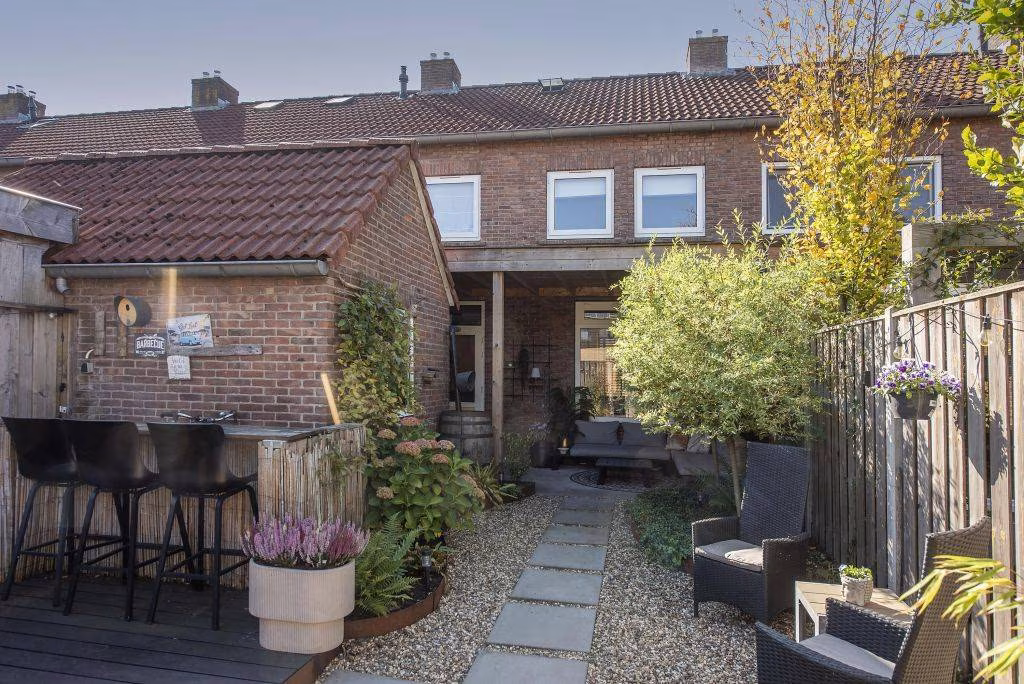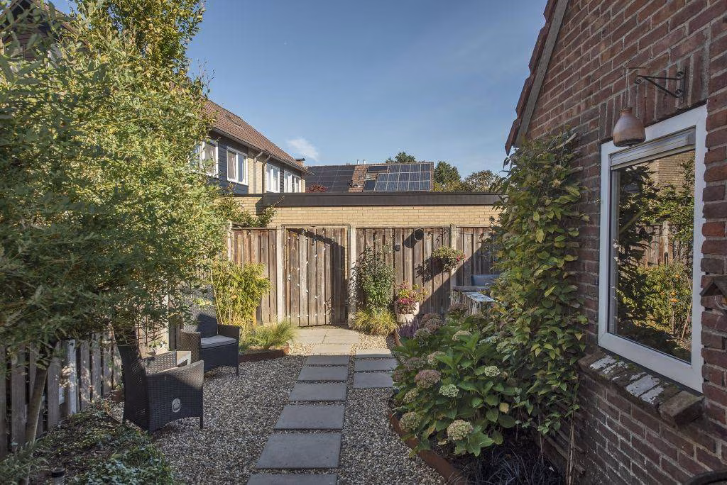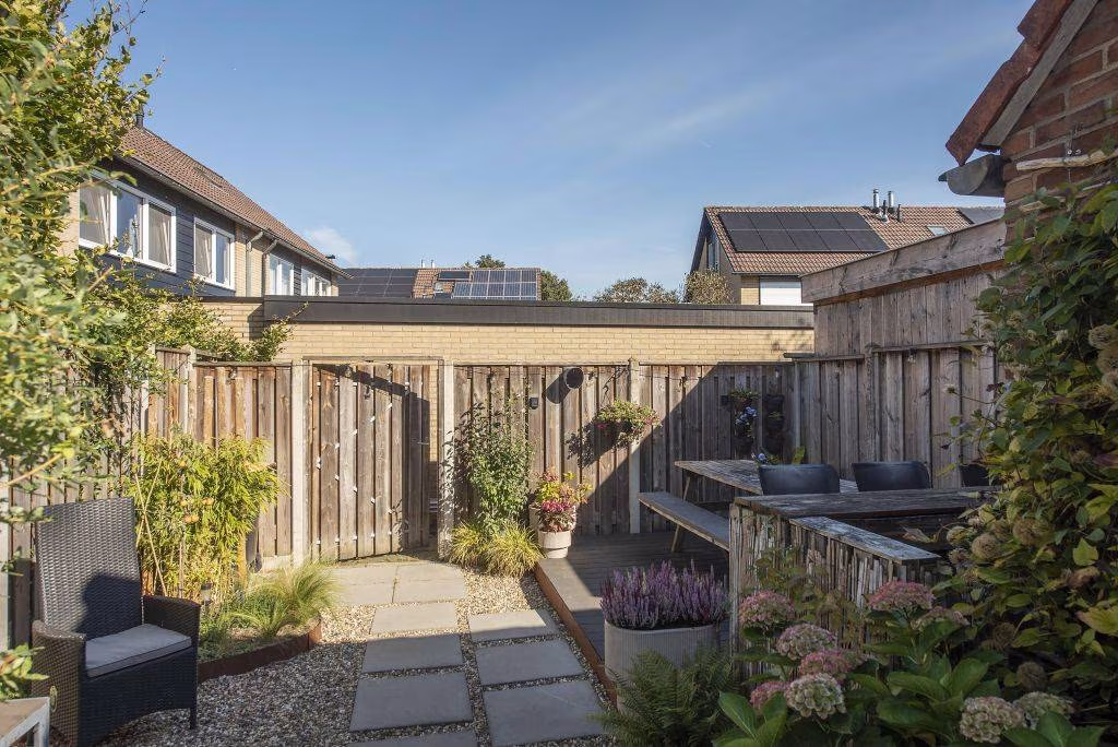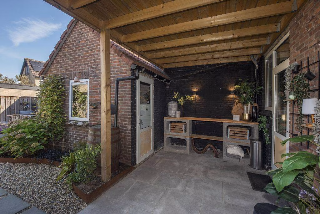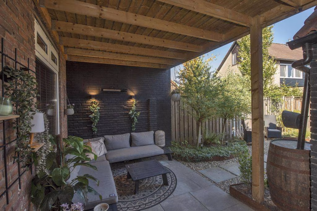 Die maakt het plaatje helemaal af. De overkapping aan de achterzijde vormt een verlengstuk van je woonkamer – een heerlijke loungeplek waar je het hele jaar door kunt zitten. De rest van de tuin is onderhoudsvriendelijk aangelegd met groenaccenten, grind en een royaal terras. Achterin staat een stenen berging en er is een achterom aanwezig. De ligging op het zuidwesten zorgt voor volop zon, maar dankzij de overkapping kun je ook in de schaduw relaxen.