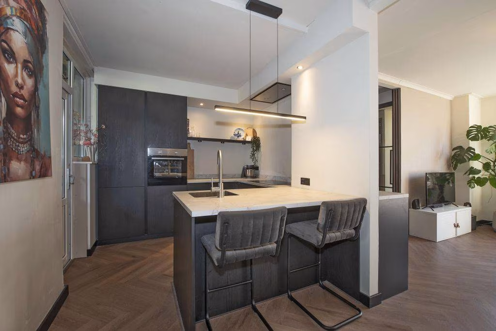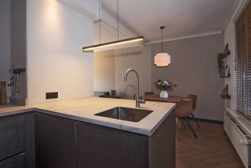 Achter de karakteristieke gevel met de herkenbare ruitramen schuilt een lichte en verrassend ruime woning. De woonkamer aan de voorzijde is een sfeervolle plek met een warme uitstraling, mede dankzij de de moderne wandafwerking en het speelse lichtinval. De ruimte loopt door naar de moderne keuken met gezellige ontbijtbar – een plek waar je met gemak de dag begint met een kop koffie.