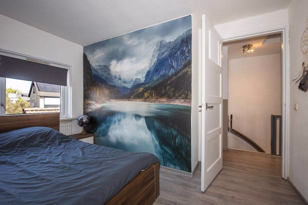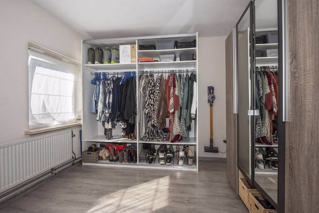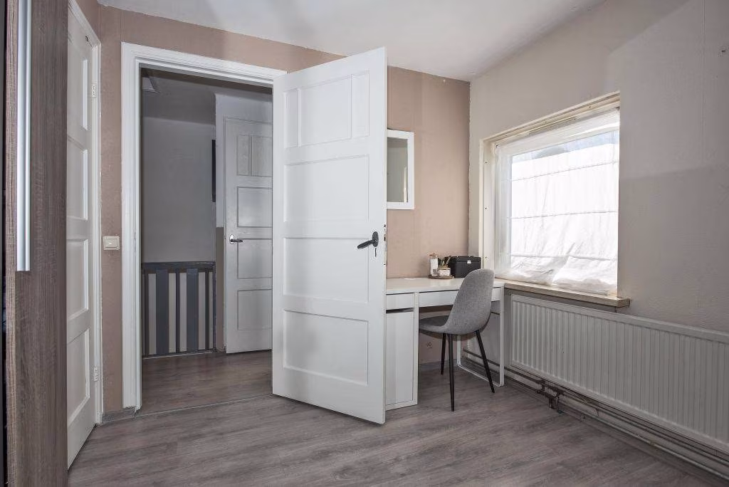 Op de eerste verdieping vind je drie slaapkamers, allemaal met laminaatvloeren en prettige lichtinval. De hoofdslaapkamer ligt aan de achterzijde en is ruim genoeg voor een groot bed en garderobekast. De tweede kamer wordt nu gebruikt als werkkamer – ideaal voor thuiswerk of hobby – en de derde kamer is ingericht als kleedkamer. De badkamer is modern betegeld en uitgerust met een inloopdouche en wastafel. Tevens is er een aparte ruimte met wasmachineaansluiting.