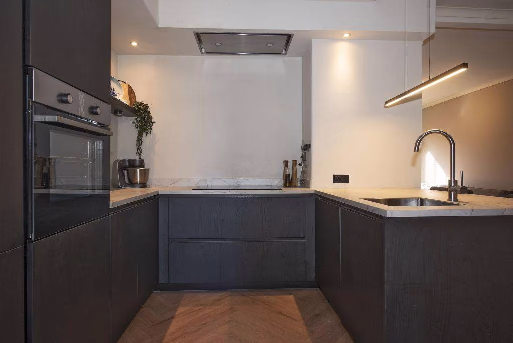 De keuken (vernieuwd in 2022) is uitgevoerd in een donkere, stijlvolle kleurstelling met een composiet werkblad. Vanuit hier loop je direct de tuin in of naar de bijkeuken/berging met extra opbergruimte en aansluitingen voor witgoed.