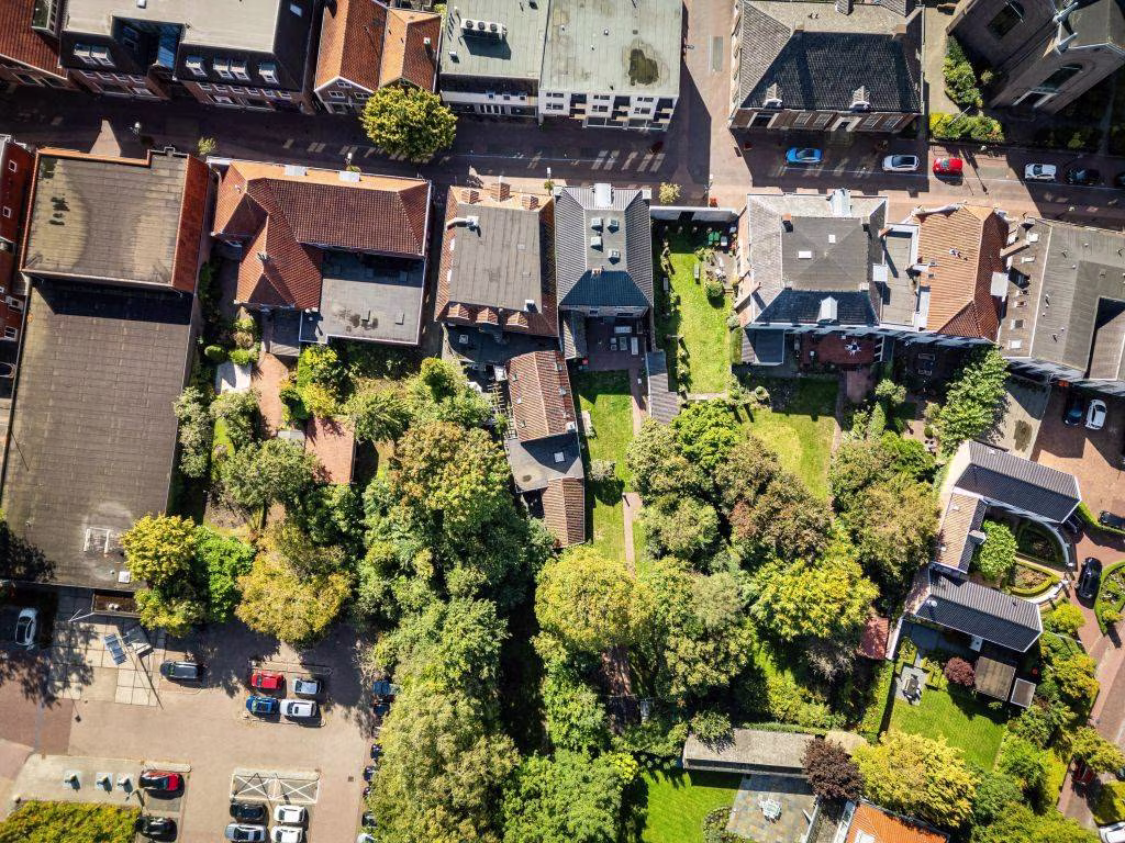 De hal geeft toegang tot de woonkamer en-suite. Ook hier is de sfeer uit de bouwperiode perfect geconserveerd. In beide vertrekken ligt de oorspronkelijke vloer van brede, massief eikenhouten planken. Magnifiek, zoals de (hoge) plafonds zijn gedecoreerd met artistiek stuukwerk. De zithoek is ingericht aan de voorzijde. In de zwarte marmeren schouw zien we een houtstookplaats. De hoge vensters hebben vensterbanken-met-zitruimte én inpandige luiken. De doorgang naar de achterkamer kan worden afgesloten met dubbele, mooi uitgewerkte schuifdeuren (die lopen als een tierelier). De aftimmering aan weerskanten is fraai en functioneel: vaste kastruimte/boekenplanken. Ook de aangrenzende achterkamer heeft een zwarte marmeren schouw met houtstookplaats. De dubbele tuindeuren zijn in drievoud uitgevoerd. Het buitenste stel is openslaand, de middelste deuren draaien naar binnen. En daar zien we dan bovendien twee dichte houten schuifdeuren, ook weer mooi bewerkt. Vanaf de lange eettafel kijk je de zestig meter diepe tuin in. Een groen uitzicht én veel privacy.