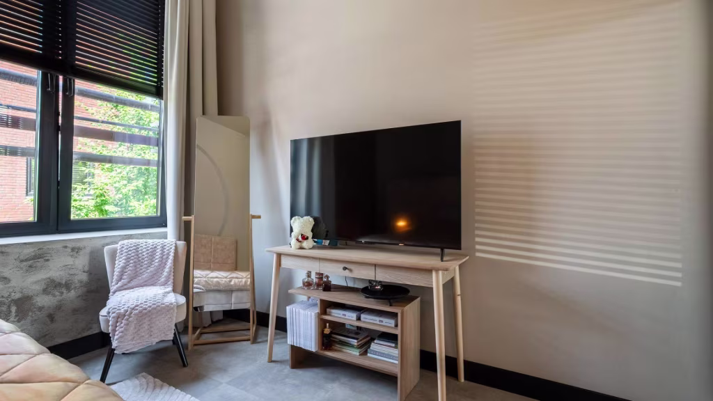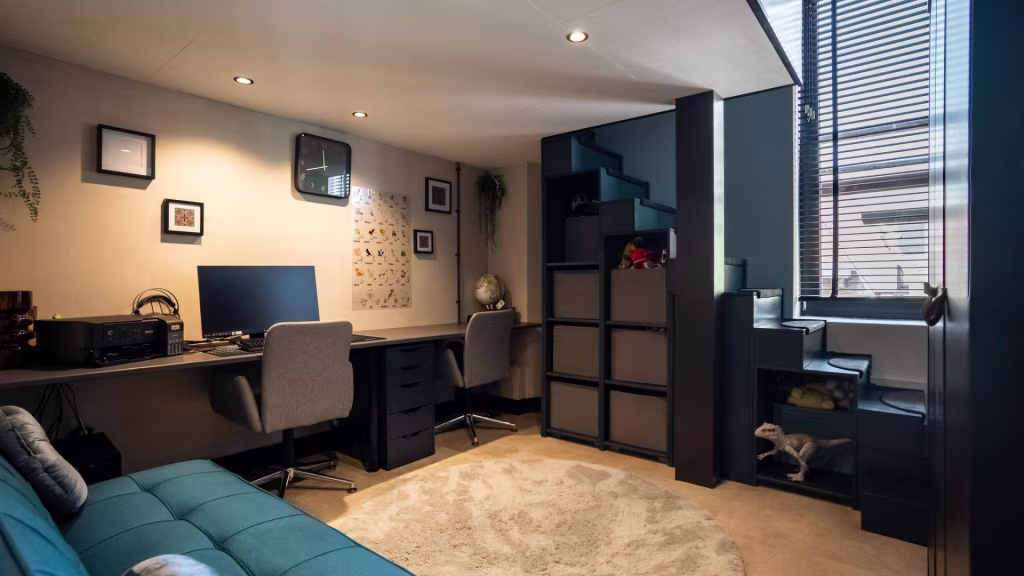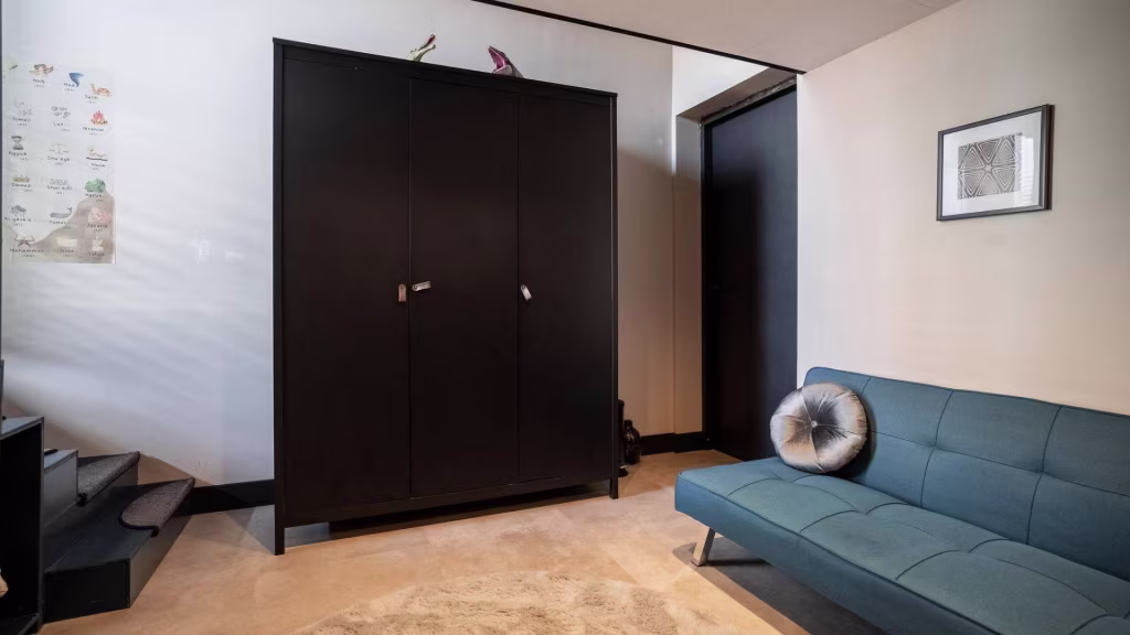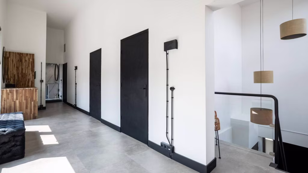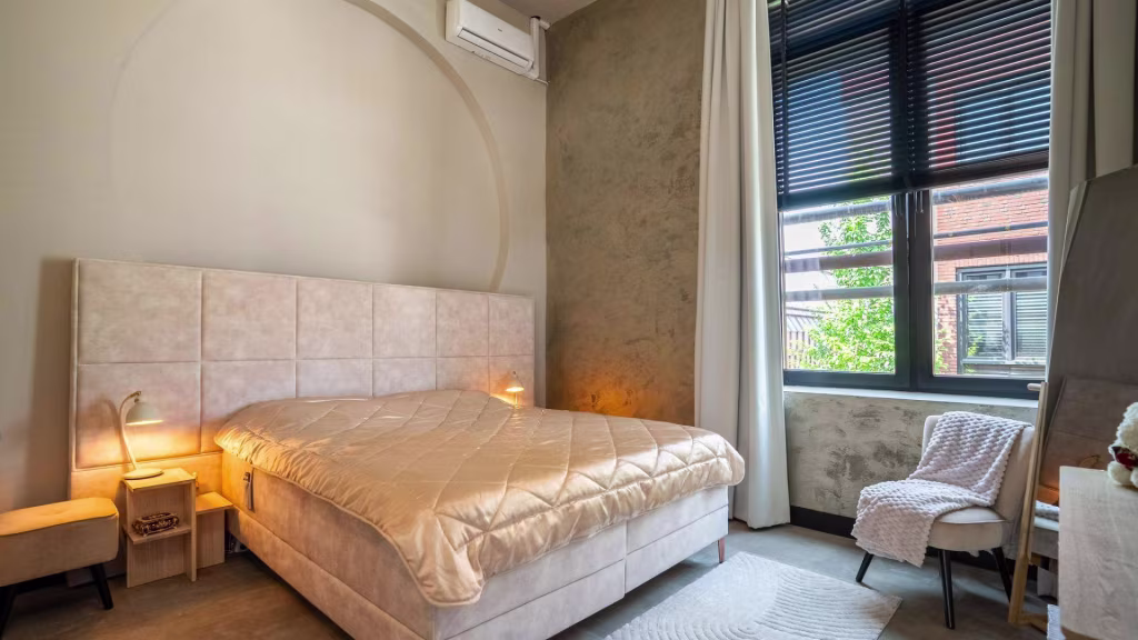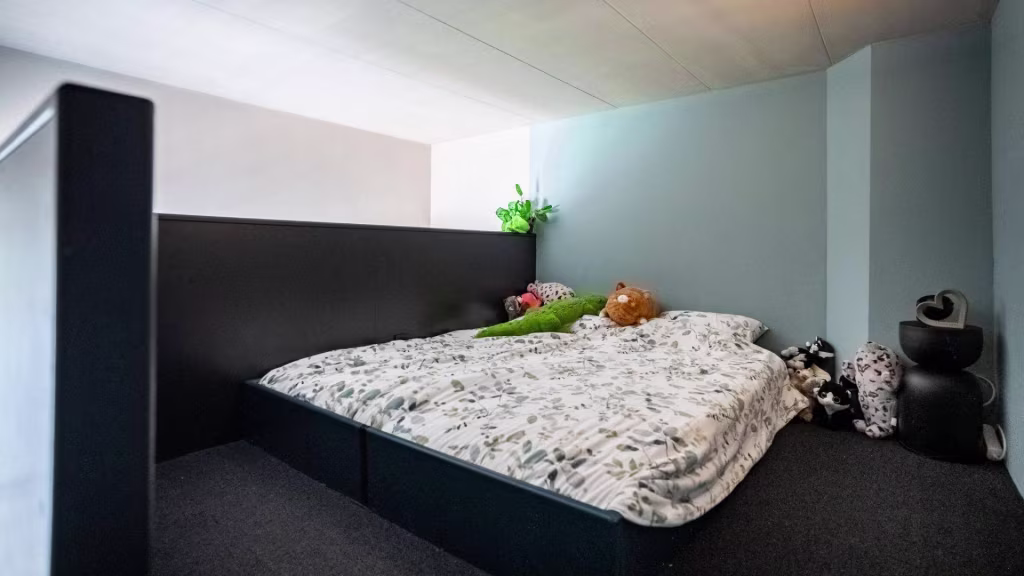 Ruime overloop met vide en apart toilet. De badkamer is strak afgewerkt en beschikt over een dubbele wastafel en inloopdouche. Er zijn twee royale slaapkamers, elk met industriële details die verwijzen naar het verleden. De derde slaapkamer wordt momenteel gebruikt als inloopkast, maar is uiteraard multifunctioneel. Dankzij de plafondhoogte van 4,40 meter voelt deze verdieping uitzonderlijk ruimtelijk aan.