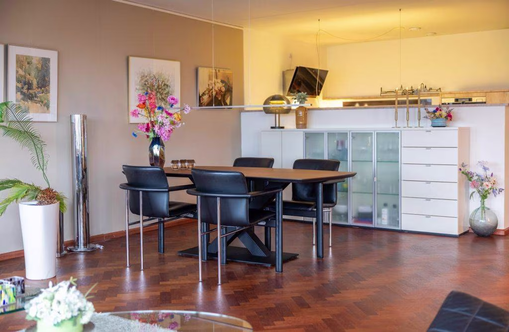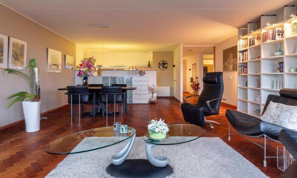 Vanuit de hal betreed je de lichte en royale woonkamer met mooie visgraat parketvloer. Grote raampartijen zorgen voor overvloedig daglicht en een aangename sfeer. Er is voldoende ruimte voor een royale zithoek én een lange eettafel.