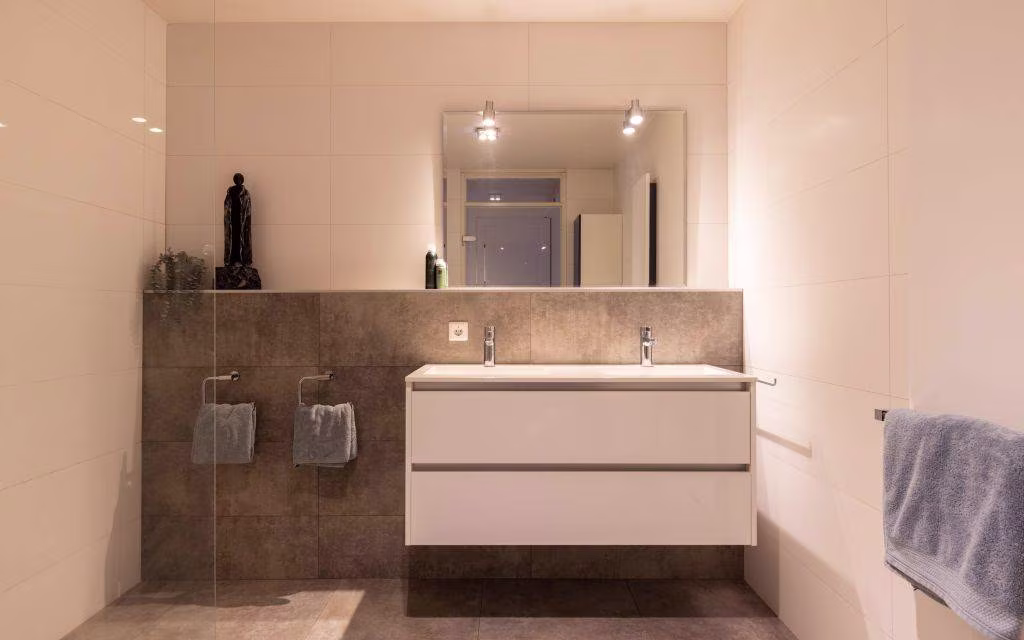 De royale badkamer biedt alle comfort met een inloopdouche, een wastafelmeubel met dubbele wastafel en een designradiator.