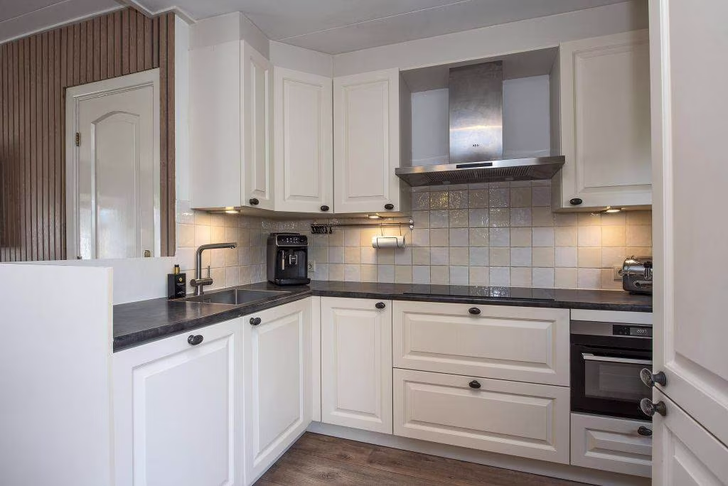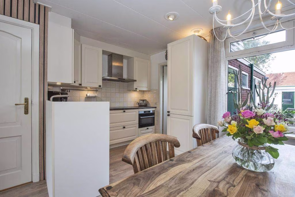 Aansluitend bevindt zich de keuken, praktisch ingericht en voorzien van inbouwapparatuur. Vanuit hier loop je door naar de aanbouw, waar zich onder andere de wasruimte en het toilet bevindt.