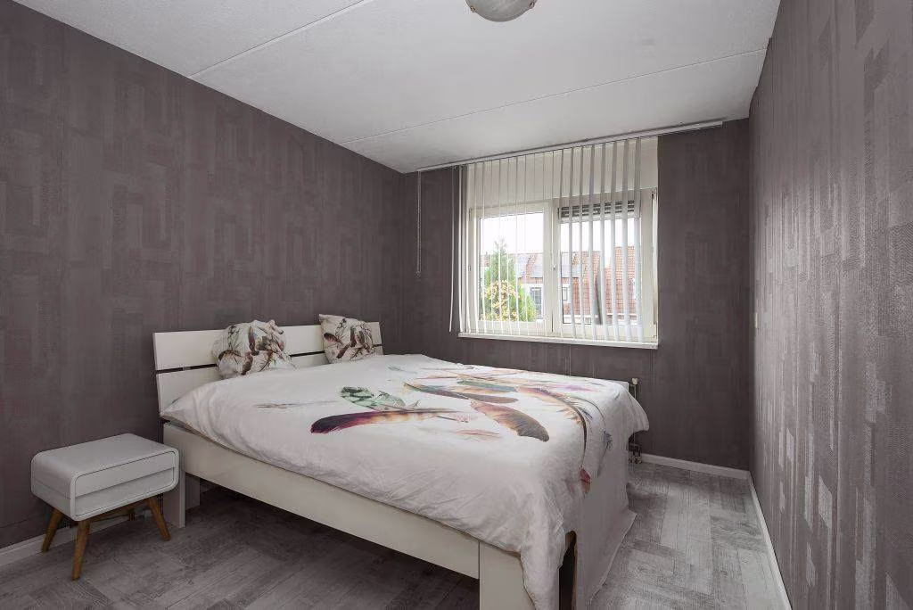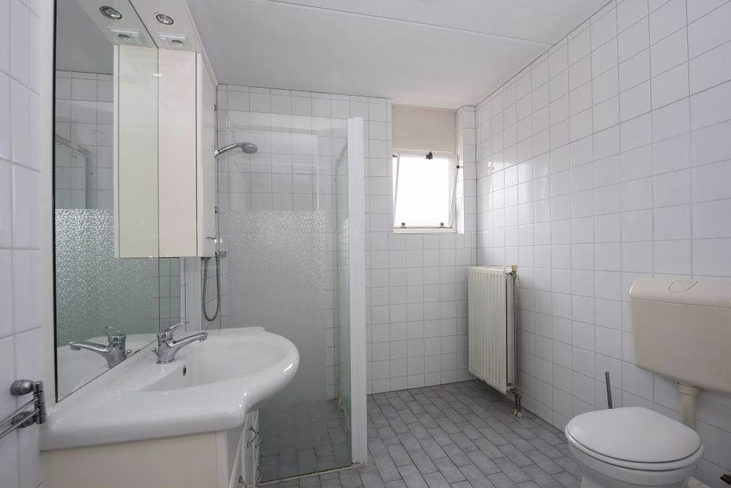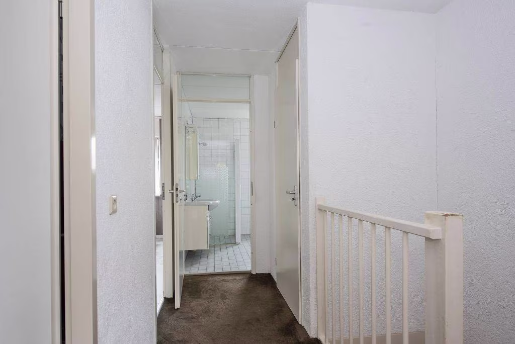 Via de overloop is er toegang tot drie slaapkamers, een badkamer en een wasruimte. Aan de achterzijde ligt de grootste slaapkamer: een sfeervolle kamer met genoeg plek voor een tweepersoonsbed en een grote kast. Dankzij het brede raam valt hier veel daglicht binnen. Aan de voorzijde liggen twee extra slaapkamers, beide met een fijn uitzicht op de groene bomen voor het huis. De kamers zijn praktisch van formaat en daardoor ideaal als kinderkamer, werkkamer of hobbyruimte. De vloeren en muren vormen een neutrale basis, zodat je er met een kleine ingreep je eigen sfeer kunt creëren. De badkamer is praktisch, maar verrassend ruim en volledig wit betegeld. Je vindt er een inloopdouche, wastafelmeubel met opbergruimte en toilet. Op de overloop bevindt zich bovendien een praktische wasruimte met aansluitingen voor wasmachine en droger. Alles netjes bij elkaar.