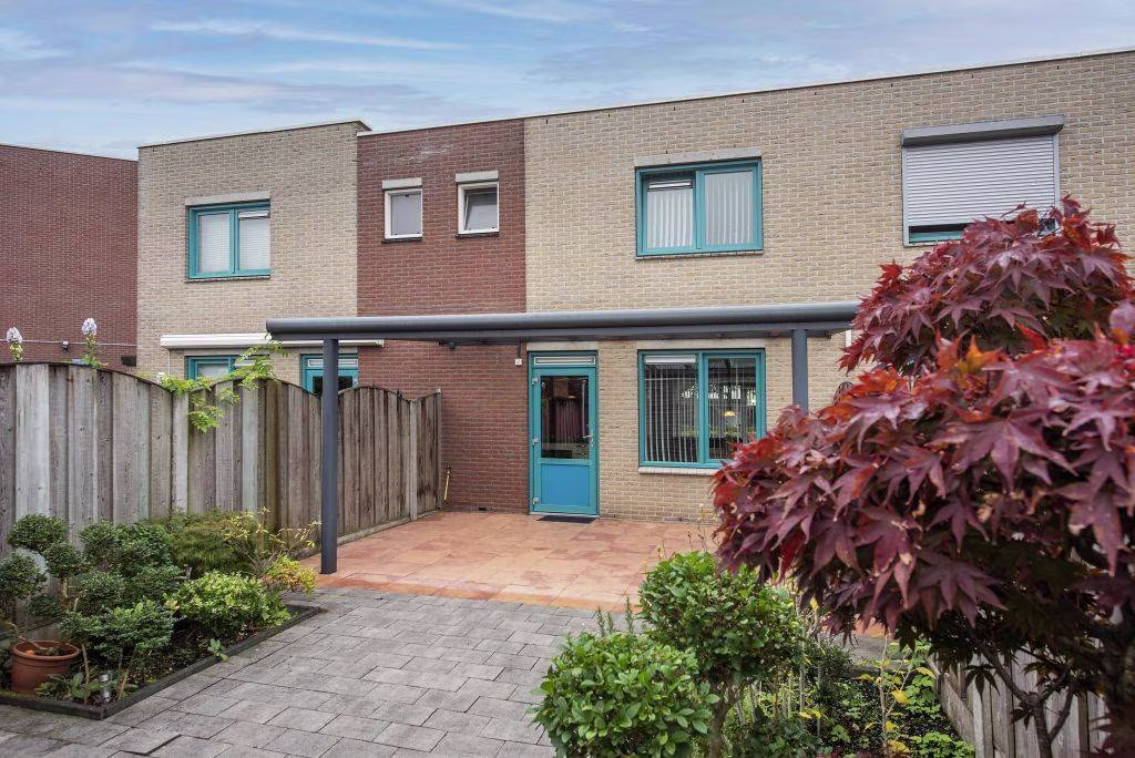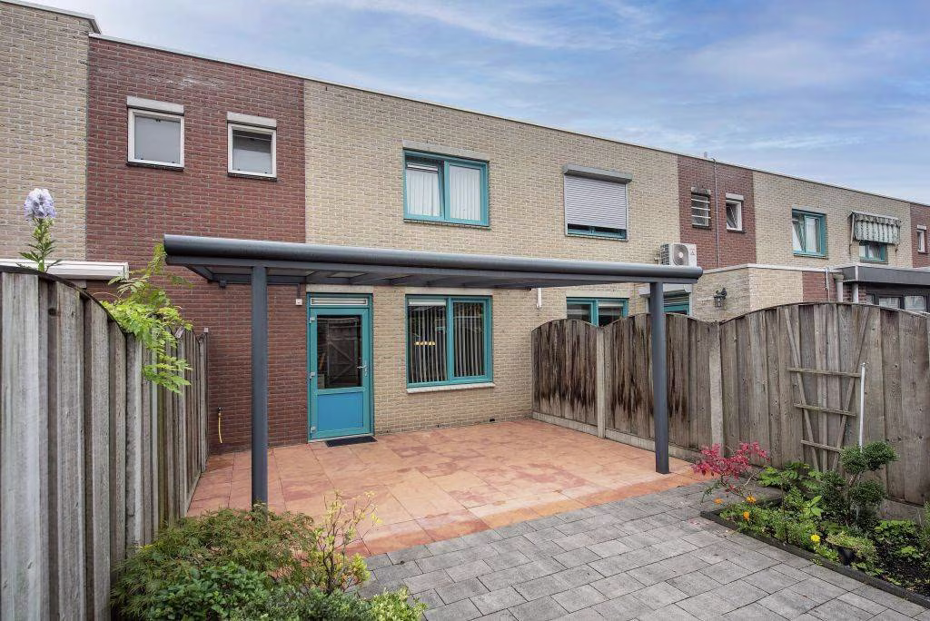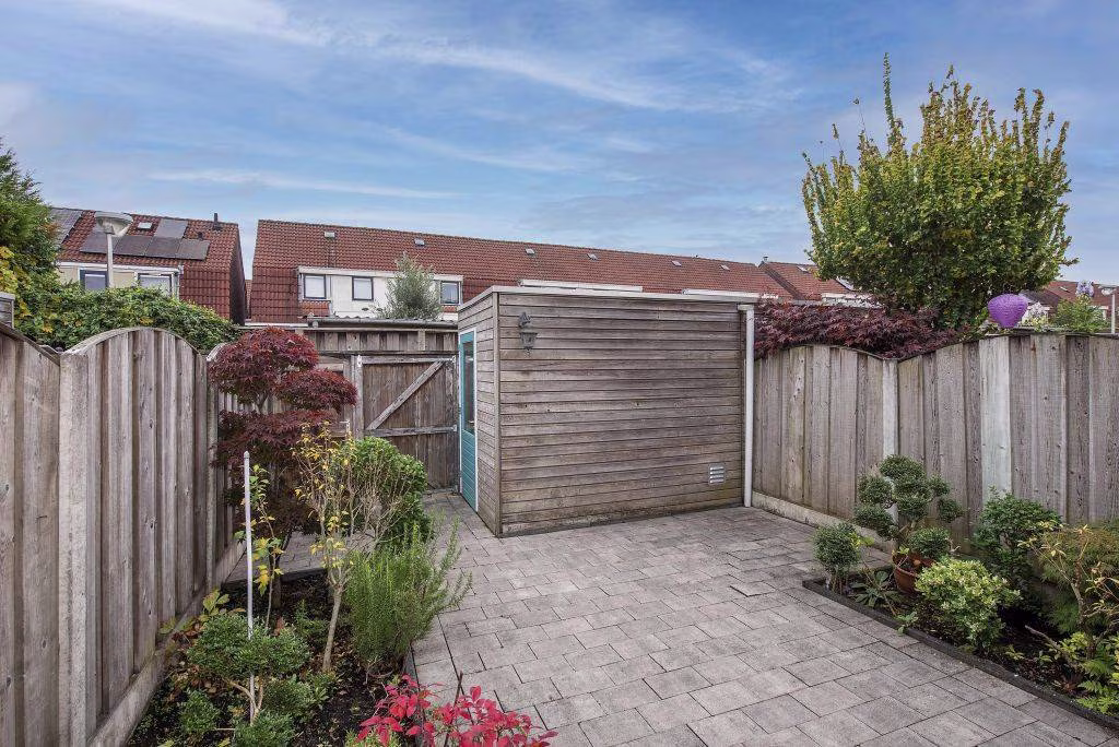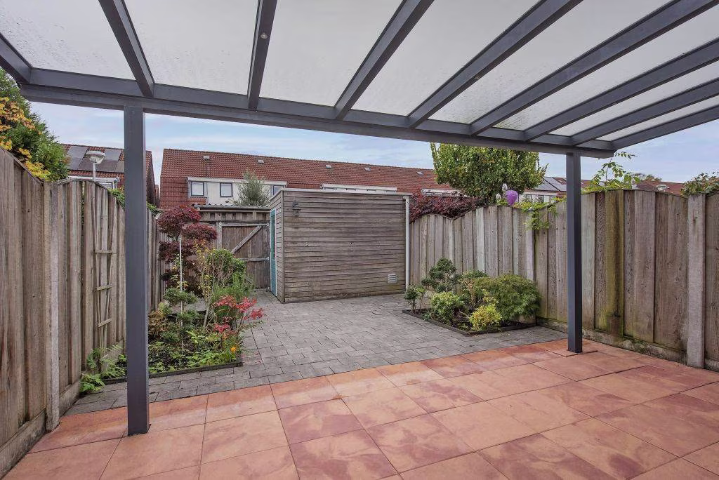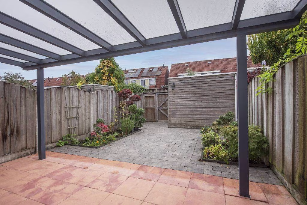 De achtertuin ligt op het oosten en is onderhoudsvriendelijk aangelegd, ideaal voor wie houdt van gemak. ’s Ochtends geniet je hier van de eerste zonnestralen tijdens het ontbijt, terwijl de overkapping zorgt dat je ook bij minder weer droog en beschut buiten kunt zitten. Het ruime terras biedt volop plek voor een eettafel of loungeset. Verderop zorgen de verhoogde plantenborders met groen en bloeiende beplanting voor een gezellige, natuurlijke uitstraling. Achterin de tuin staat een houten berging, handig voor fietsen, tuingereedschap en andere spullen. Dankzij de achterom stap je zo het achterpad op.