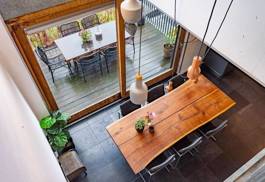 Je merkt het aan de manier waarop de dag begint. Zonlicht dat 's ochtends via de keuken naar binnen schijnt, en in de middag juist door het grote panoramische hoekraam de woonkamer binnenvalt. Kinderen spelen beneden in de tuin terwijl jij aan de eettafel zit met uitzicht op het park. En ’s avonds, als het rustig wordt in de straat, kijk je vanaf het balkon of het dakterras uit over de wijk — de lichten, het groen, de lucht. Het voelt vrij. En thuis.