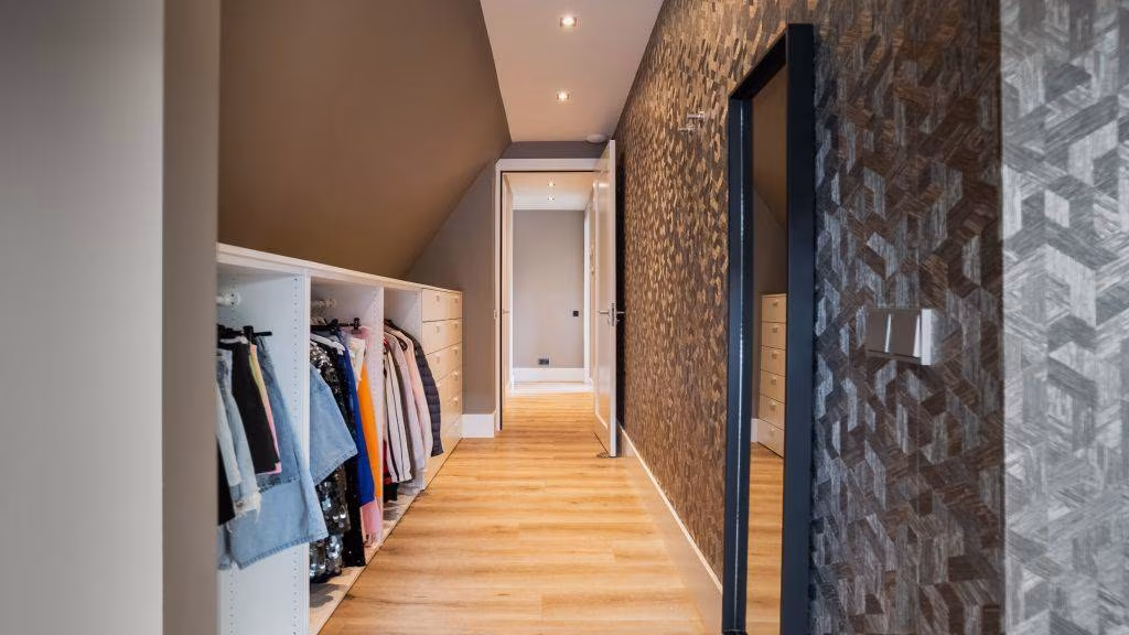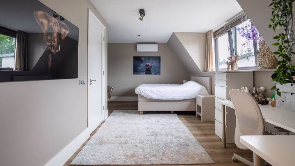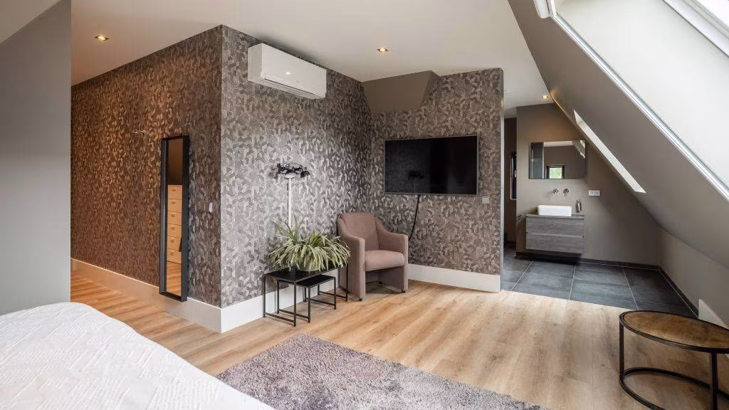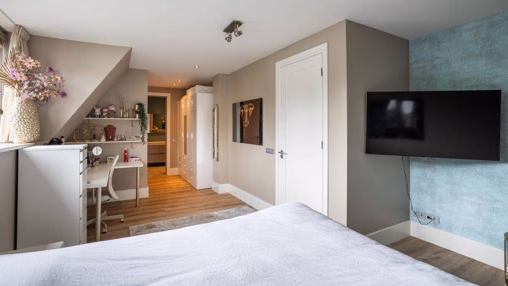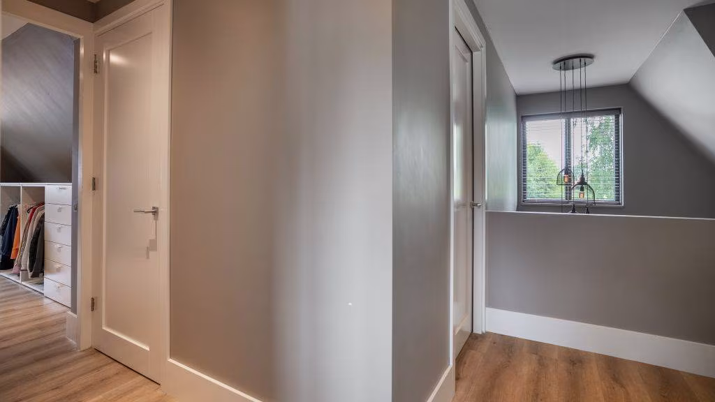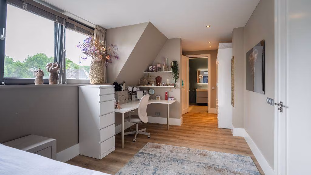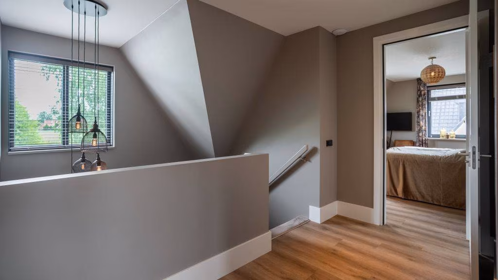 Een royale overloop met vide zorgt voor een indrukwekkende entree naar de slaapverdieping. Hier bevinden zich drie zeer ruime slaapkamers, elk ingericht als een ware hotelsuite: compleet met tweepersoonsbed, een eigen inloopkast én toegang tot een luxe badkamer.