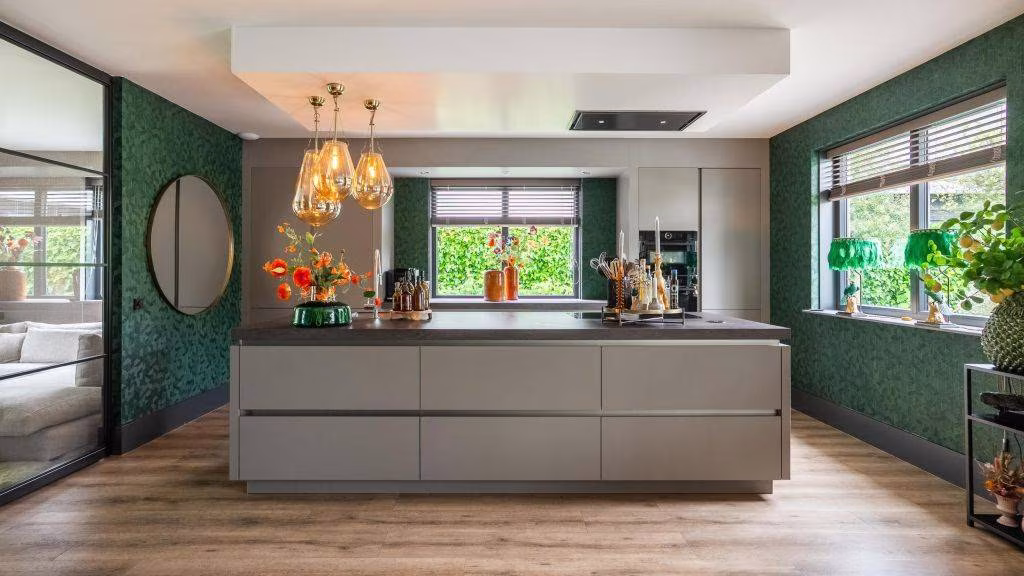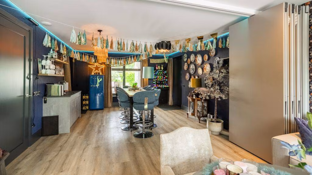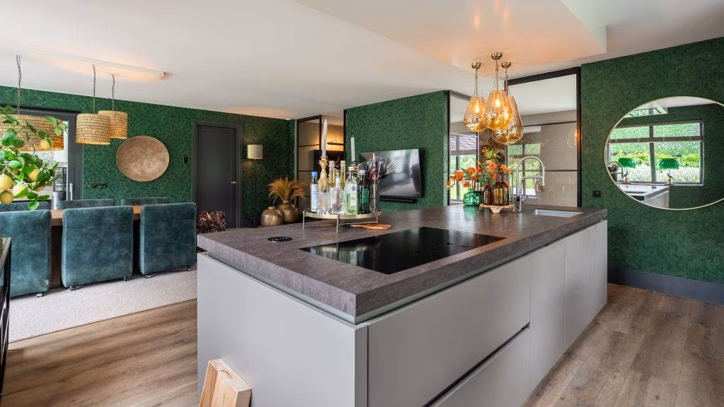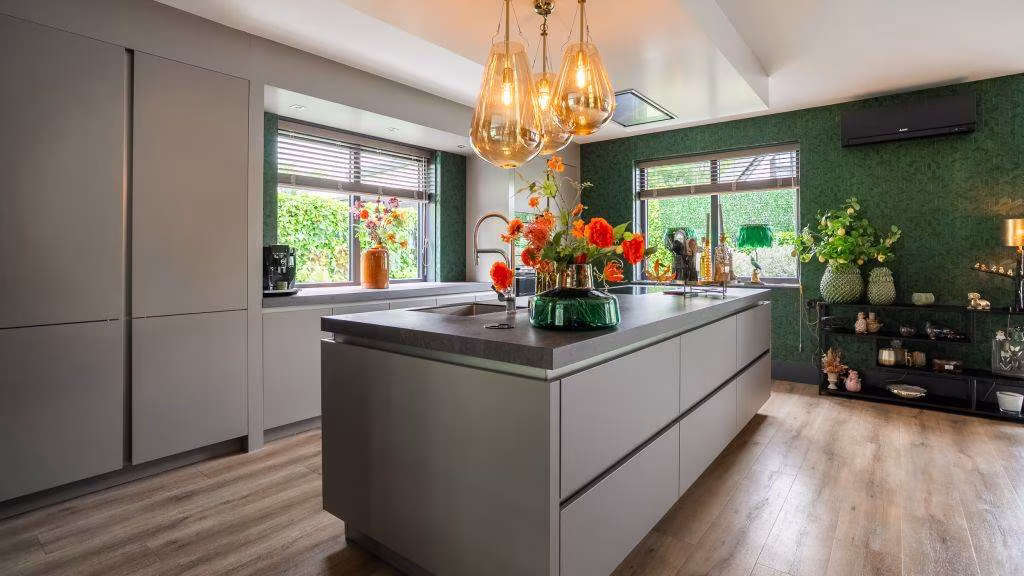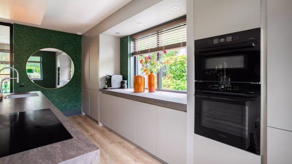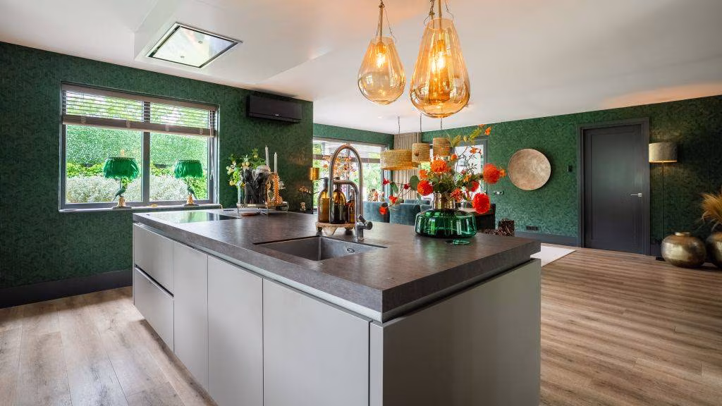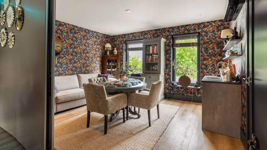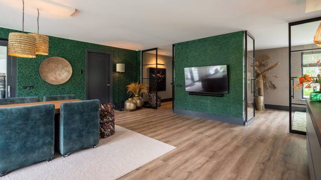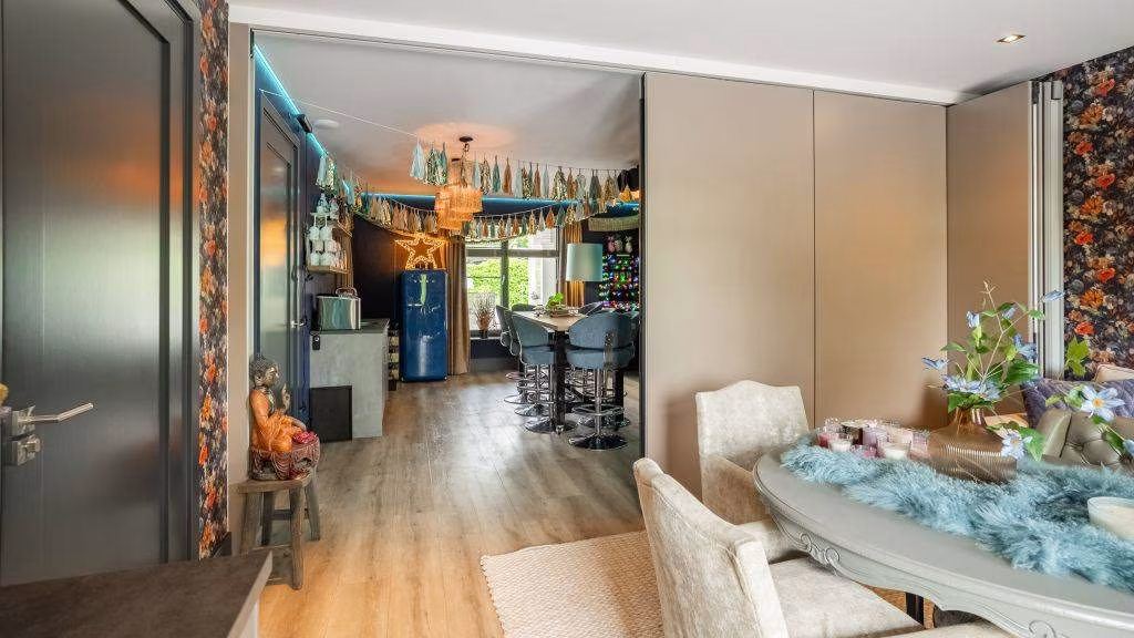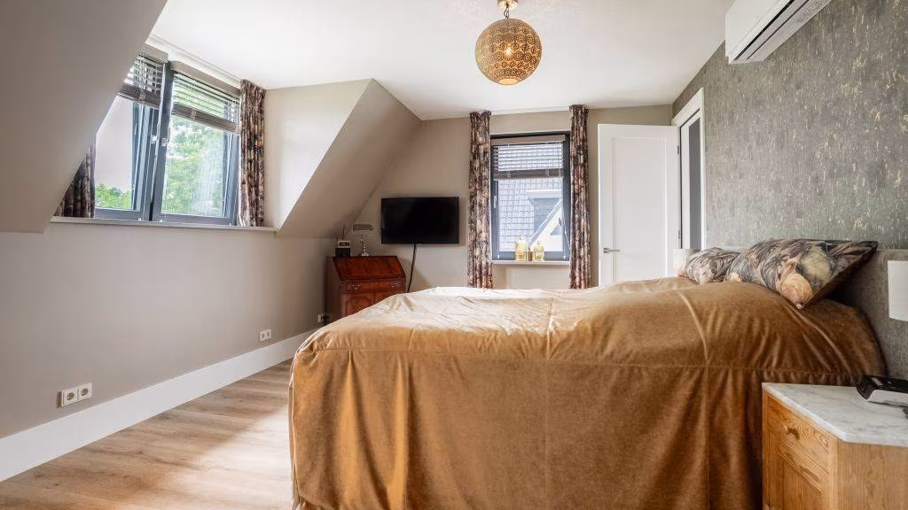 Centraal in de woning bevindt zich de ruime woonkeuken – een echte eyecatcher. Hier vindt u een luxe keukenopstelling met hoogwaardige apparatuur, veel werkruimte en een warme, uitnodigende sfeer. De TV-kamer aan de voorzijde is een fijne plek om te ontspannen en biedt een mooi uitzicht op de omgeving.