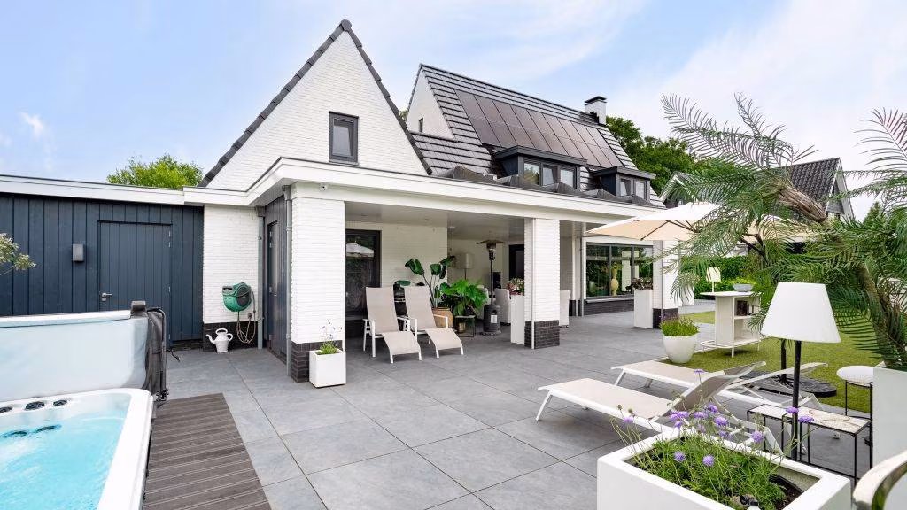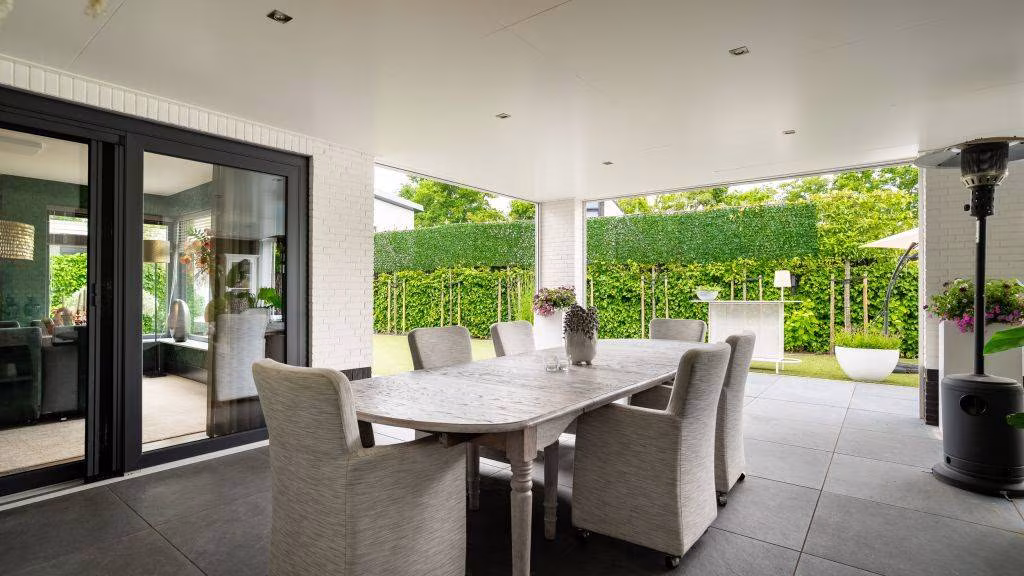 Buiten is het volop genieten onder de stijlvolle veranda, een verlengstuk van het woongenot – zomer én winter.