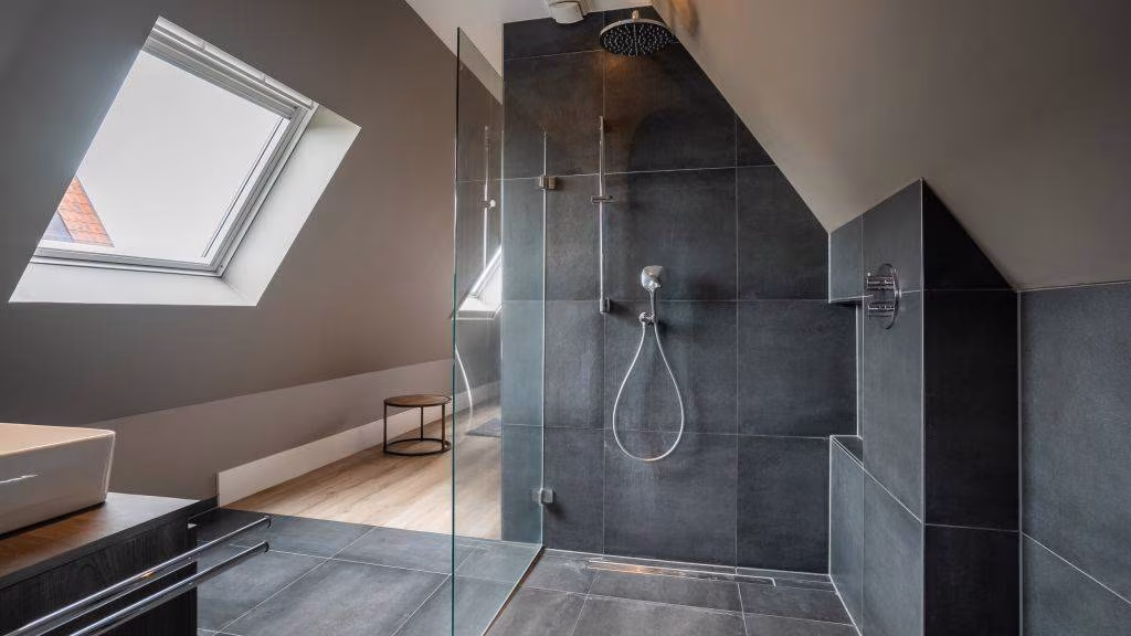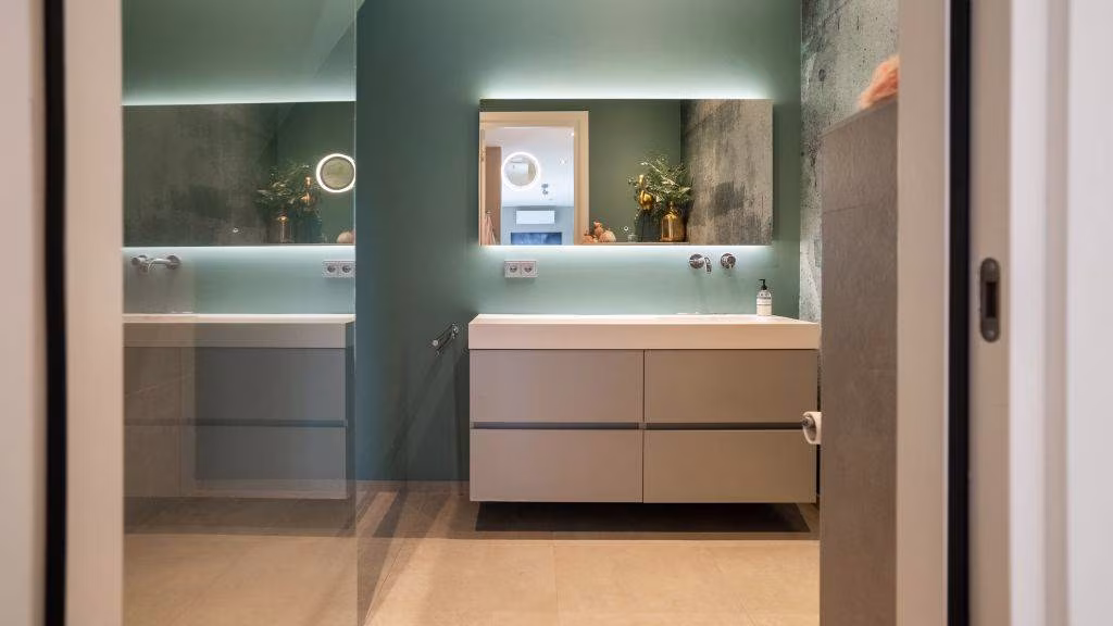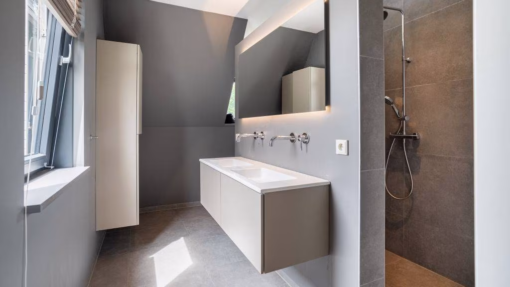 De hoofd-badkamer is bijzonder stijlvol afgewerkt met hoogwaardige materialen, inloopdouche, vrijstaand ligbad en dubbele wastafel. Op deze verdieping is tevens een aparte waskamer, voorzien van aansluitingen voor wasmachine en droger – praktisch én netjes weggewerkt.
