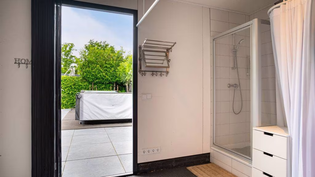 De bijkeuken met achterdeur zorgt voor extra gemak, net als de separate praktijkruimte met een eigen entree en toilet – perfect voor een salon, kantoor aan huis of chillruimte voor opgroeiende kinderen. Aangrenzend vindt u de berging met douche, ideaal in combinatie met de luxe zwemspa in de tuin.