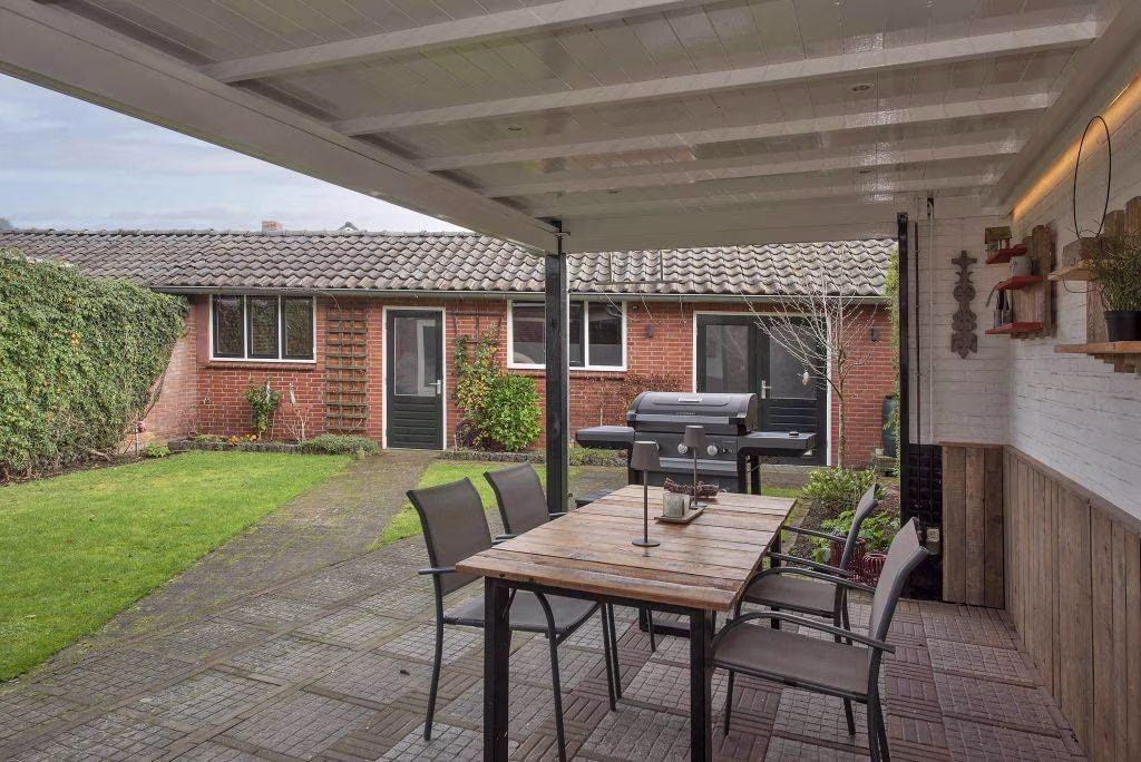De achtertuin van deze woning is diep, groen en met meerdere plekken om fijn buiten te zijn. Direct achter de woning ligt een terras met overkapping, perfect voor lange avonden buiten of een beschutte plek op warmere dagen. Verderop in de tuin is volop ruimte voor een speelgedeelte, een loungeset of juist een rustige zitplek.