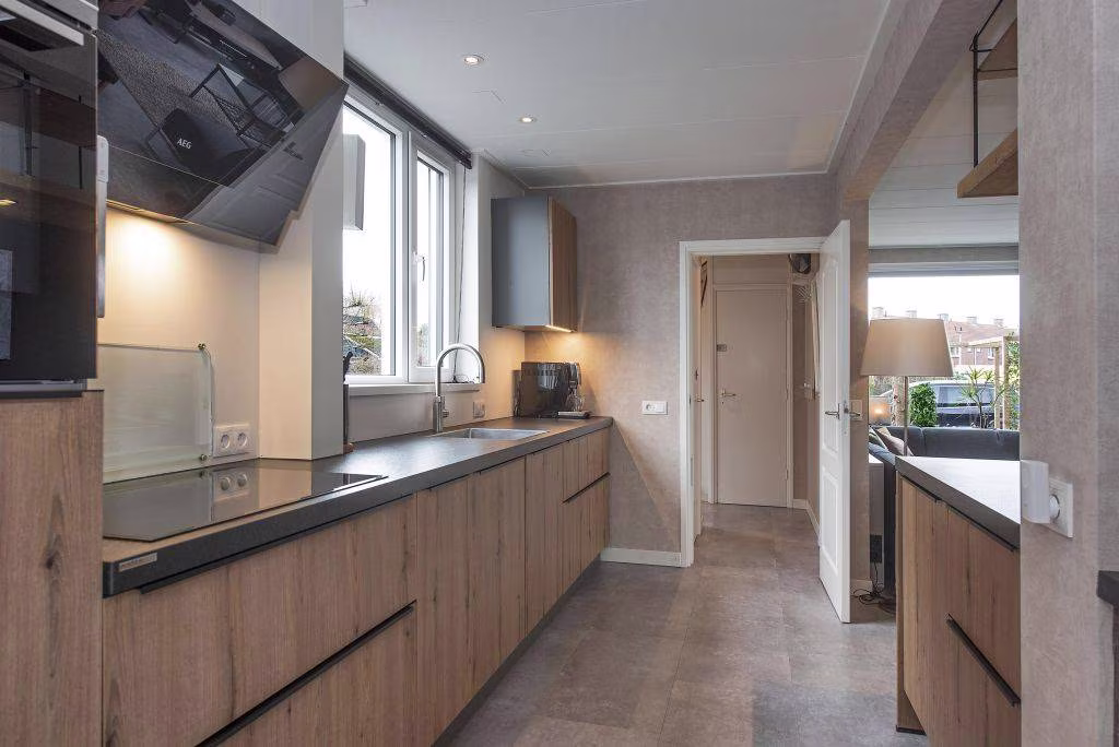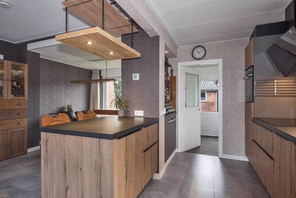 Wanneer je via de hal binnenkomt, vind je hier het toilet, de meterkast en de trapopgang. Vanuit de hal stap je als eerste de ruime leefkeuken binnen. Dit is het hart van de woning: modern ingericht, praktisch opgezet en voorzien van alle gewenste inbouwapparatuur zoals kookplaat, afzuigkap, koelkast, vriezer, combioven, vaatwasser en quooker. Achter de keuken vind je de bijkeuken, een praktische plek met extra opbergruimte en de wasvoorzieningen. Ideaal voor voorraad of dagelijkse spullen.