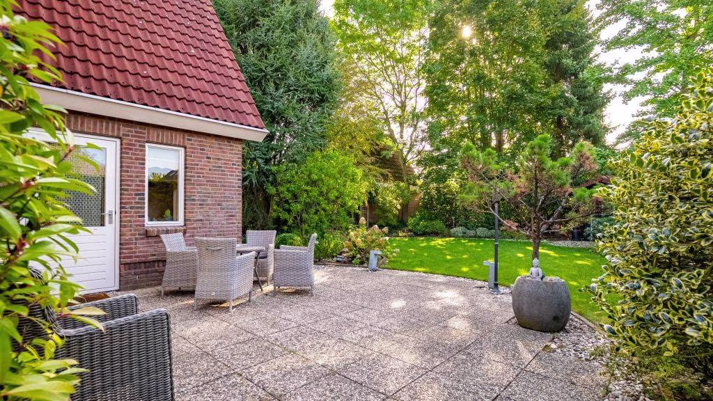 De achtertuin is een oase van rust: vrij gelegen, met volop ruimte voor meerdere terrassen en speelgelegenheid. Door de vrije ligging geniet u hier in alle rust van het buitenleven.
