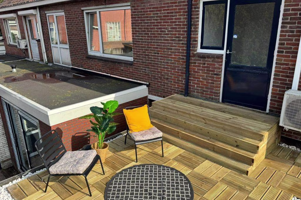 De woning heeft een patiotuin: klein, maar ideaal als onderhoudsarm buitenplekje waar je in de ochtend zit met koffie of ’s avonds de dag afsluit met een drankje. Geen uren tuinieren, wel een fijn stukje buiten.