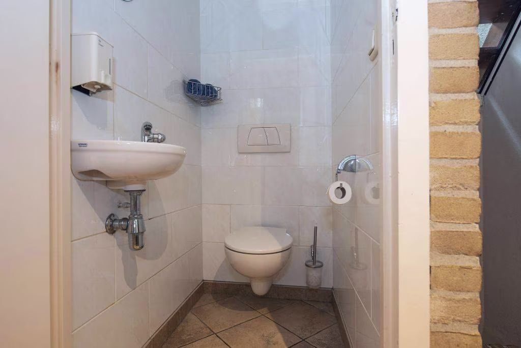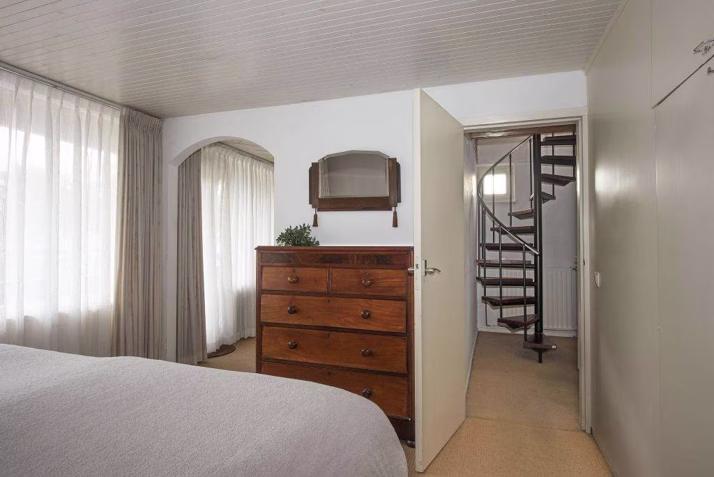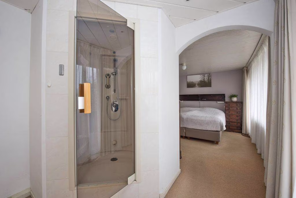 - Vanuit de ouderslaapkamer aan de achterzijde is een doorbraak gemaakt naar de van oorsprong derde slaapkamer, die nu in gebruik is als "kastenkamer" en waarin een stoomdouche cabine is geplaatst; vaste trap naar....