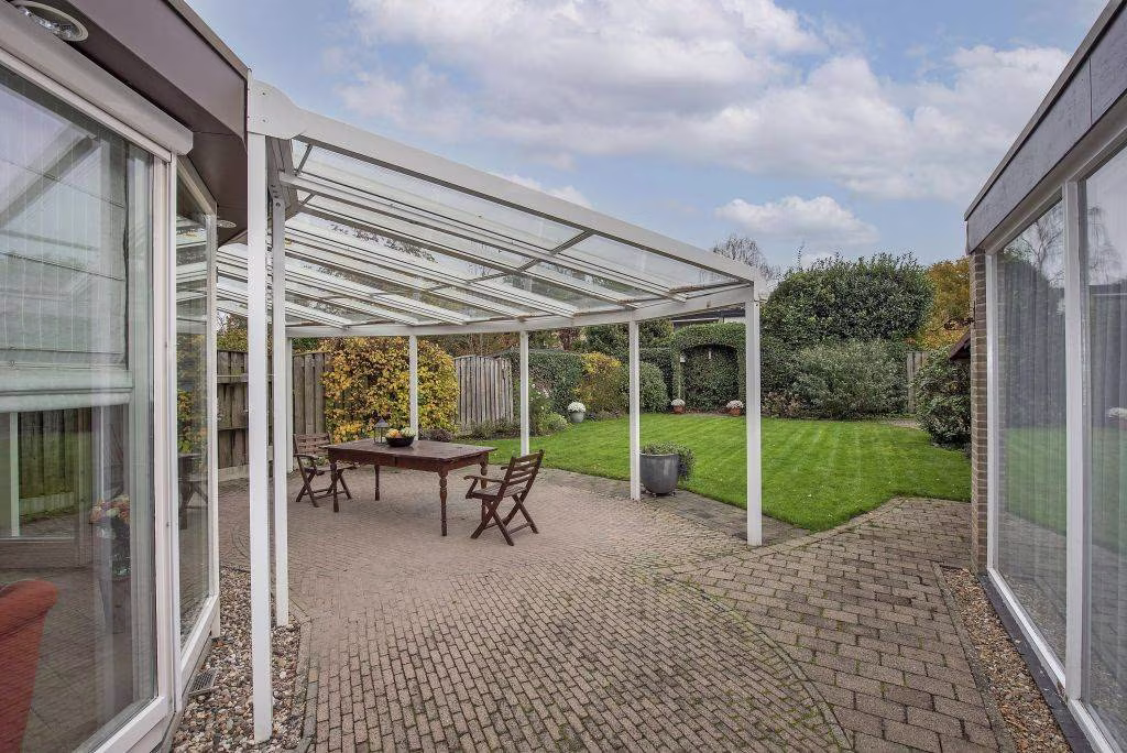 - Terrasoverkapping (2015) in vliegervorm met los zonwerend doek;
