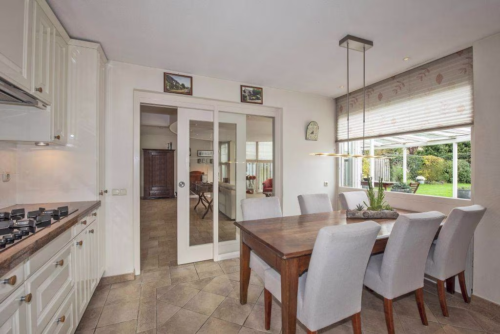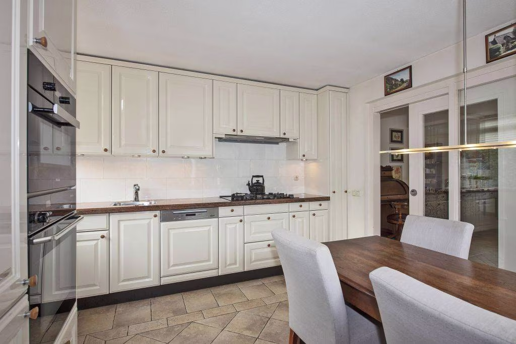 - Woonkeuken: Dichte keuken v.v. schuifdeuren naar woonkamer, met karakteristiek "bloemenraam", vernieuwd in 2000, apparatuur deels vernieuwd in 2023.