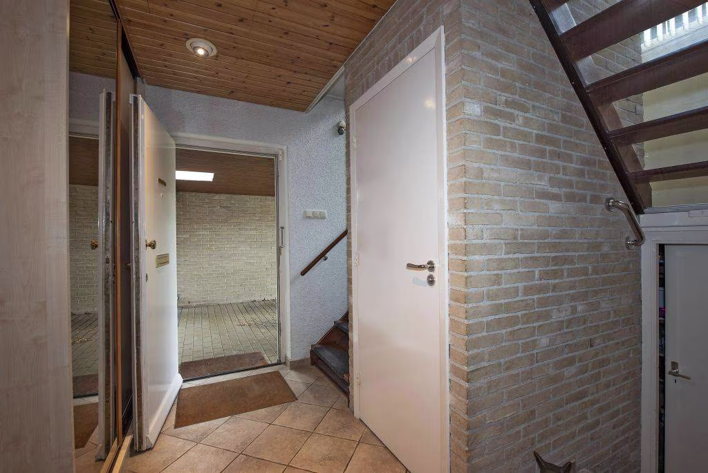 - Overdekte (vanuit de carport) entree opzij, ruime hal, toilet v.v. wandcloset en fonteintje, trapopgang en kelderkast;