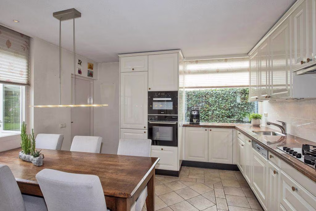 - Ruime woonkeuken met bloemenraam en L-vormig keukenblok (2000 maar tijdloos) v.v. kookplaat (gas op glas) afzuiging (2023), vaatwasser (2023), magnetron (2023), oven en koel-vriescombinatie;