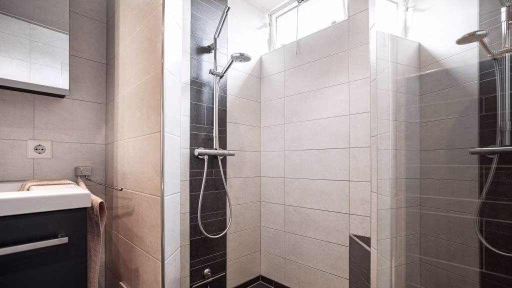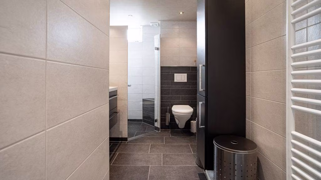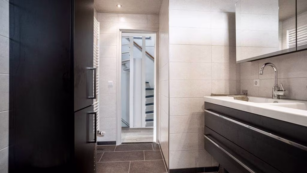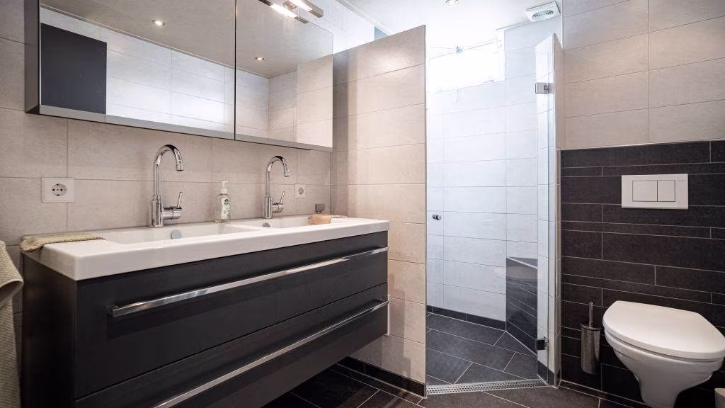 Overloop naar vier slaapkamers, trapopgang en badkamer inclusief inloopdouche, hangcloset en dubbele wastafel.