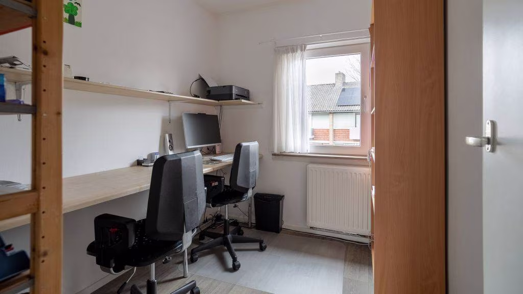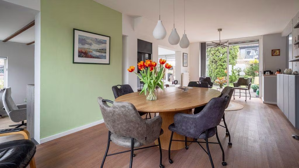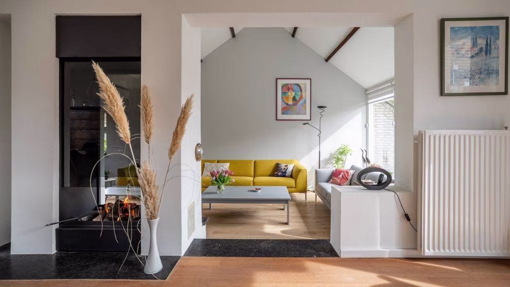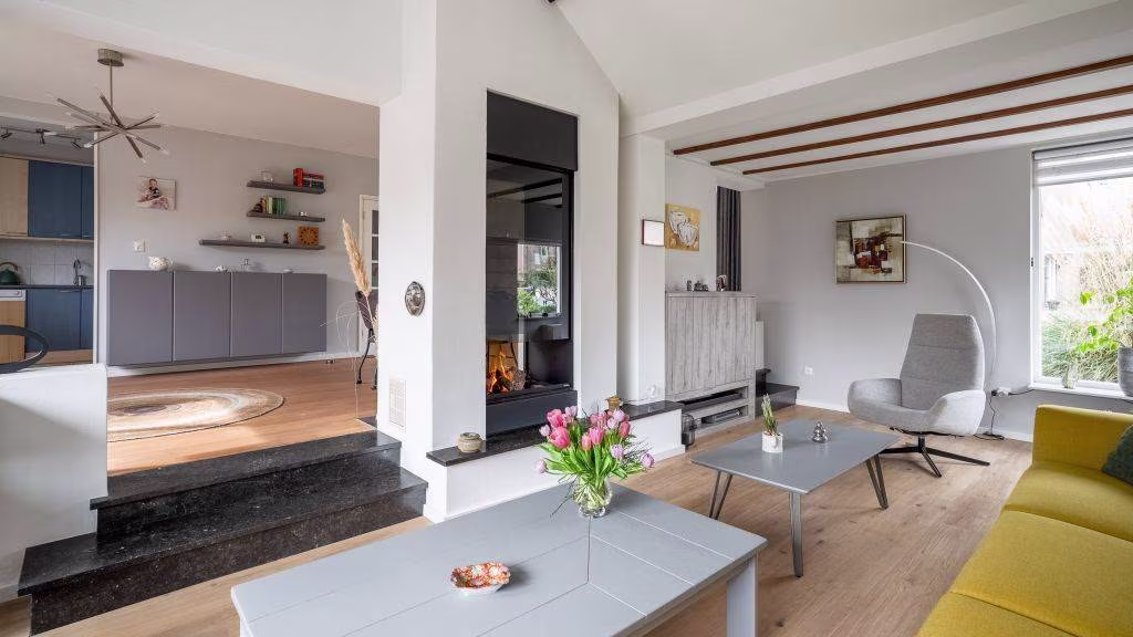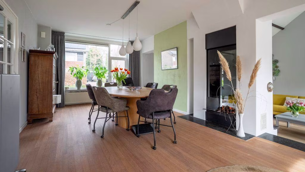 Een groot deel van de woning is voorzien van onderhoudsarme kunststof kozijnen. De sfeervolle gashaard in de woonkamer fungeert als stijlvolle roomdivider naar de eetkamer, waardoor beide ruimtes een warme en uitnodigende uitstraling krijgen.