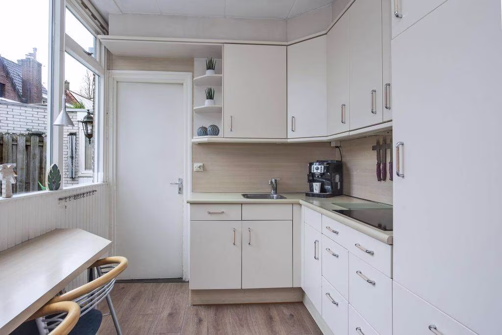 Onder de gezellige luifel met dakpannen is de voordeur. Bij binnenkomst sta je in een lichte hal met toegang tot de woonkamer, het toilet en de trap naar de eerste verdieping. De lange living ademt ruimte en de open haard vormt een warm middelpunt. Grote ramen zorgen voor natuurlijk licht en zicht op zowel de voor als achterkant van het huis. Er is ruimte voor een royale zithoek en een eettafel. De woonkamer loopt door in de open keuken. Deze is ingericht met een inductiekookplaat en een ingebouwde koelkast en beschikt over zowel boven als onder keukenkasten die praktische opbergruimte bieden. Tegenover de keuken bevindt zich een plek voor een smalle eettafel of bar tegen het raam. Achterin de keuken leidt een deur naar de bijkeuken. Dit extra kook- en werkdeel is uitgerust met een gasfornuis, combi oven en een wasbak met kraan. Hier is tevens plaats voor de wasmachine en droger, zodat alles netjes uit het zicht staat. Aan het huis op de begane grond bevindt zich een aparte berging die bereikbaar is via de achtertuin.
