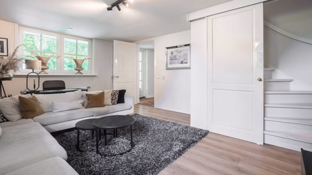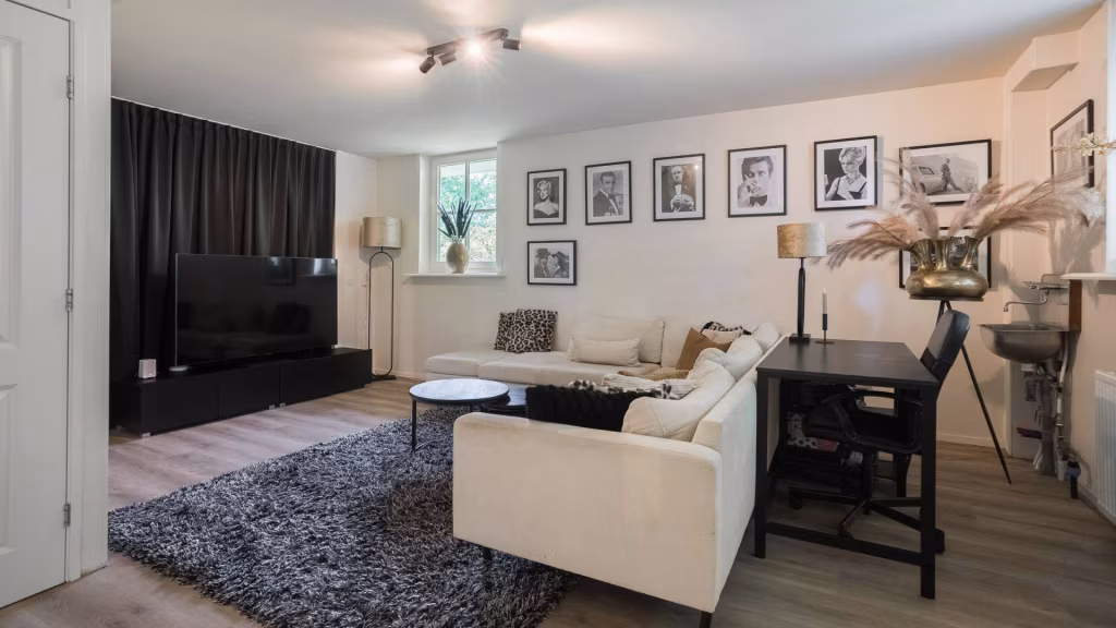 Verder vindt u op de begane grond een praktische bijkeuken met witgoedaansluitingen, een tweede toilet en toegang tot de ruime tv-kamer met tweede trapopgang. De tv-kamer is ook te gebruiken als werk-/hobbykamer óf als inpandige garage.