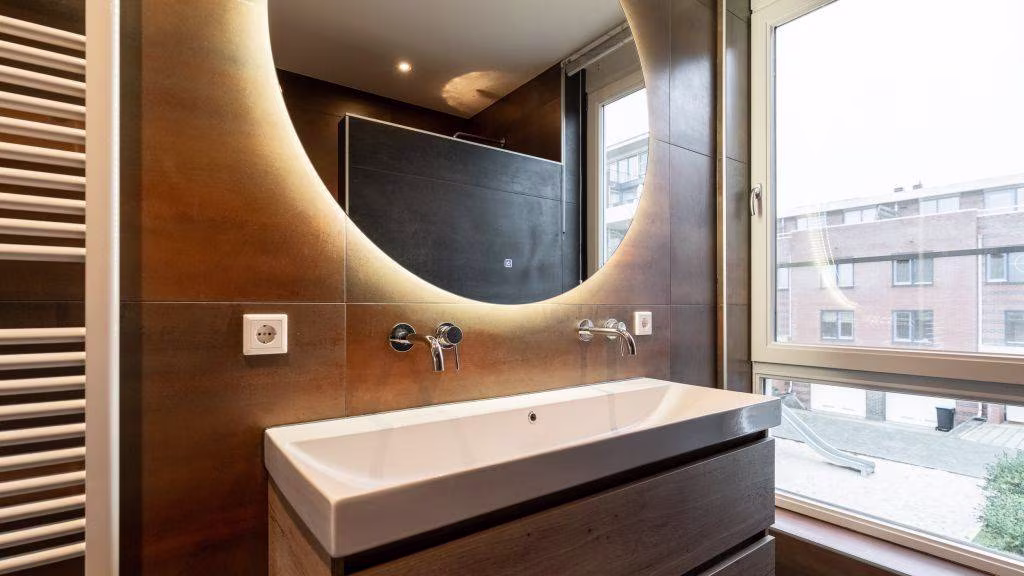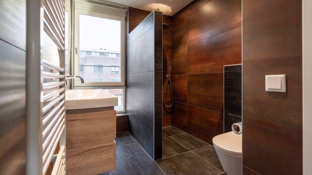 Overloop met toegang tot drie keurig afgewerkte slaapkamers. De recent gerenoveerde badkamer (2024) is voorzien van een inloopdouche, dubbele wastafel in meubel, hangend toilet en een designradiator.