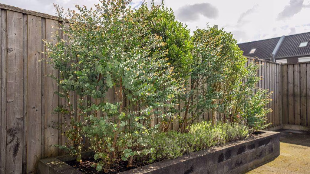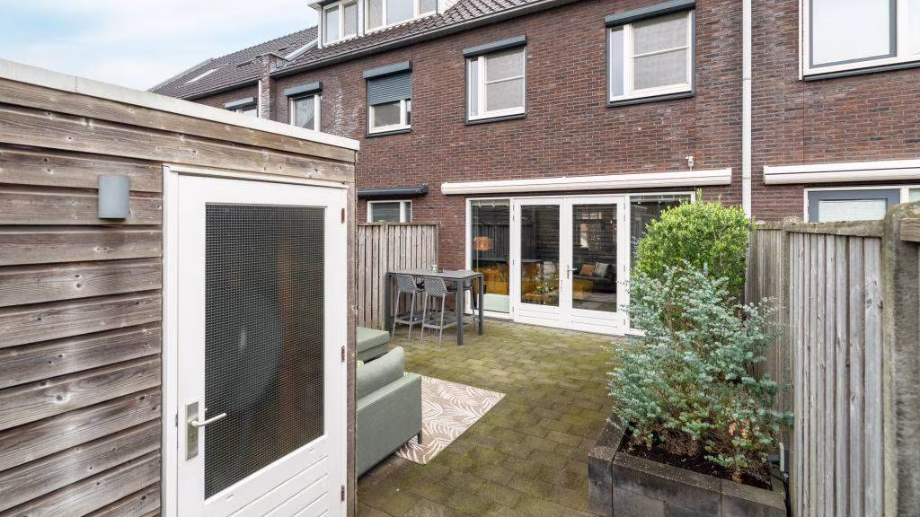 De zonnige achtertuin is gelegen op het zuiden en beschikt over een berging en een achterom.
