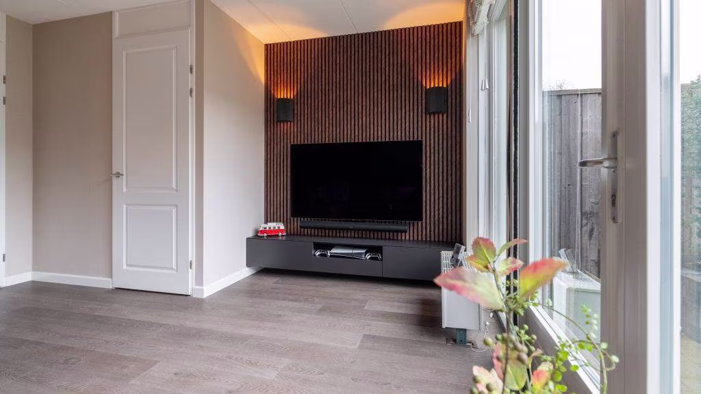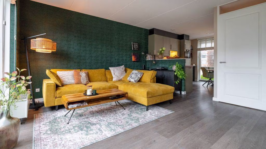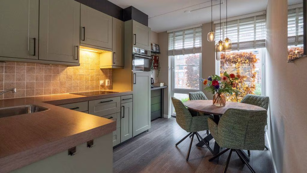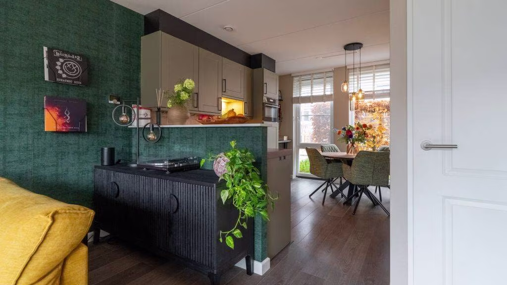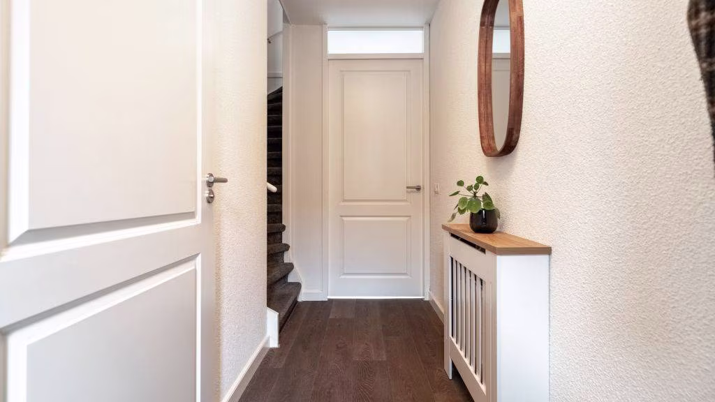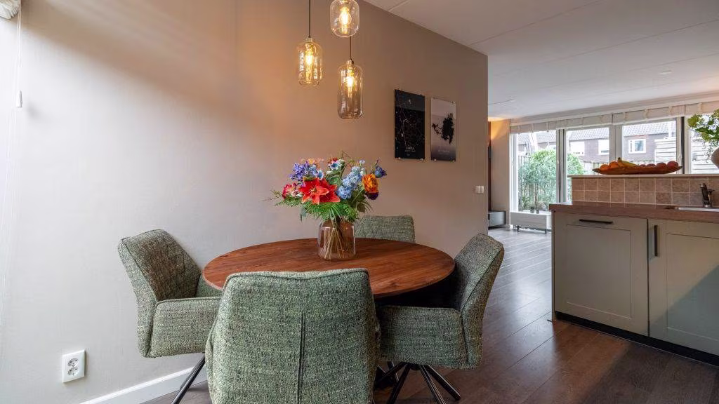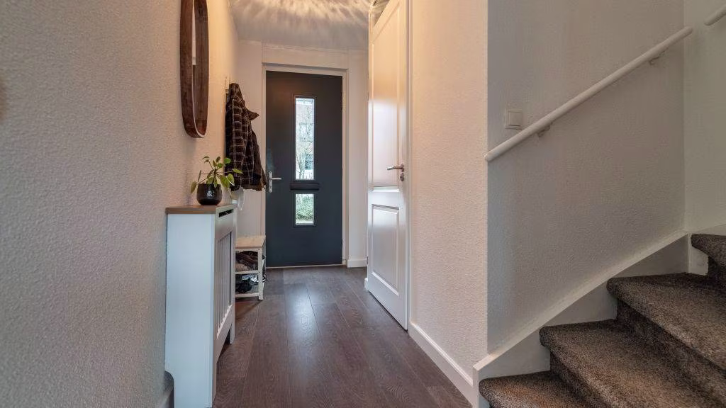 Entree/hal met meterkast en modern toilet (2024). De lichte woonkamer is voorzien van een fraaie laminaatvloer, een praktische trapkast en openslaande tuindeuren naar de achtertuin. De open hoekkeuken is uitgerust met diverse inbouwapparatuur en biedt ruimte voor een eettafel.
