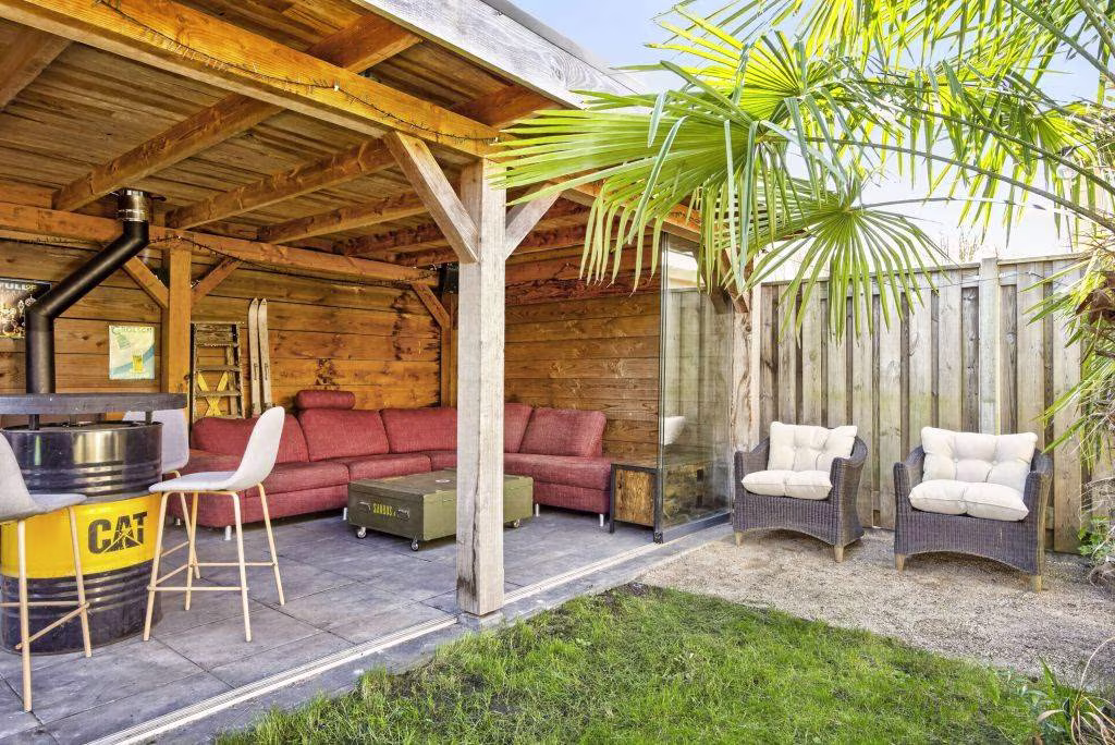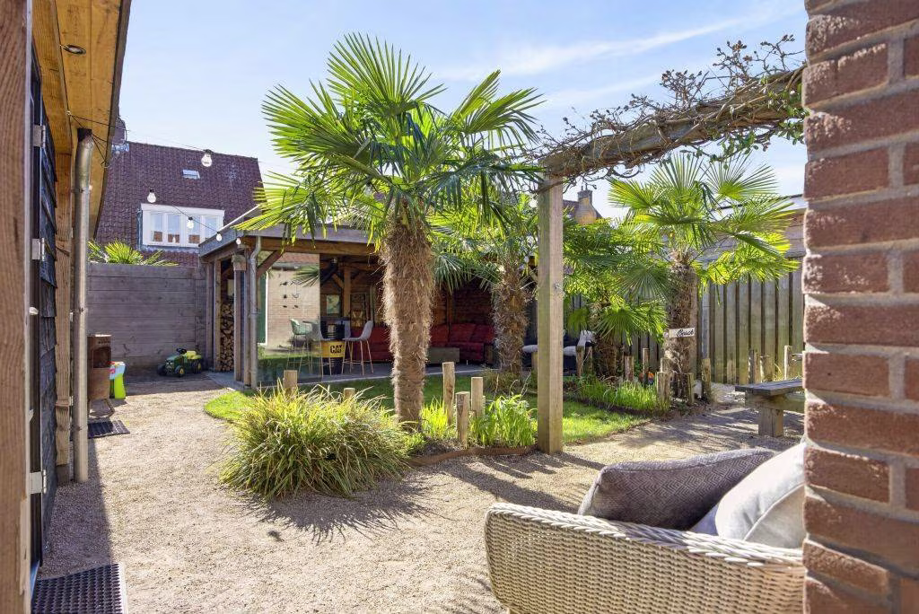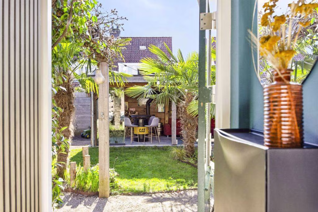 In de zonnige achtertuin ervaar je direct een heerlijke Ibiza-vibe, met meerdere palmbomen en prachtige bijgebouwen. De geïsoleerde schuur is praktisch ingericht en voorzien van de omvormer, wasmachineaansluitingen en fraaie inbouwspots in het plafond. De tweede ruimte is omgetoverd tot een echte chillroom waar je heerlijk kunt ontspannen.
