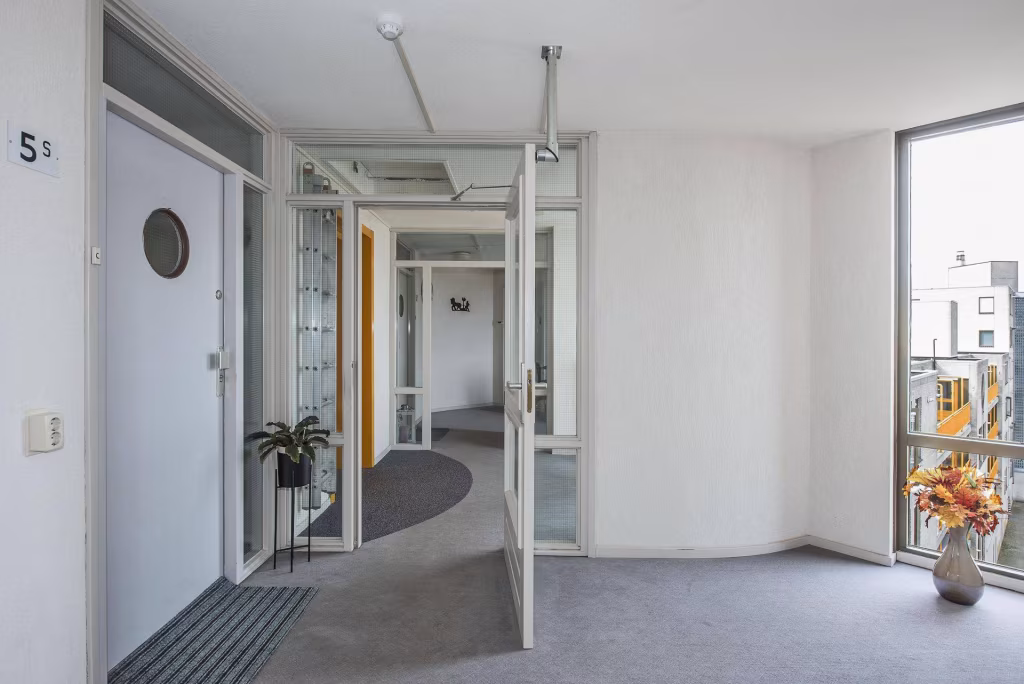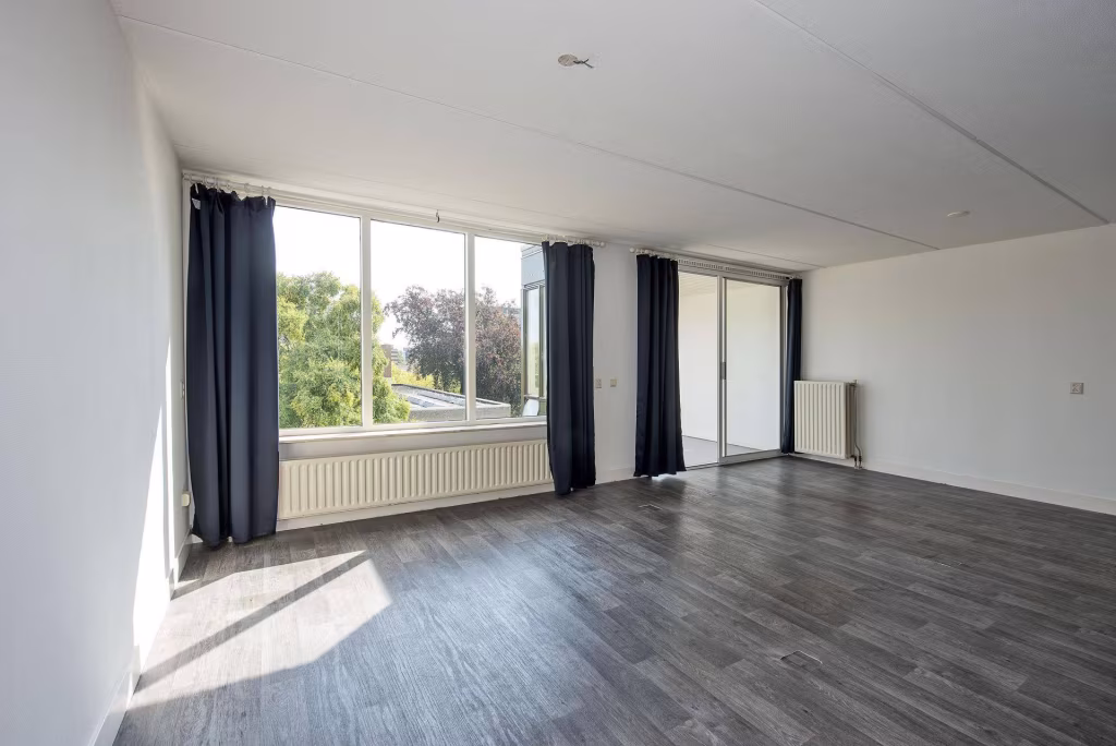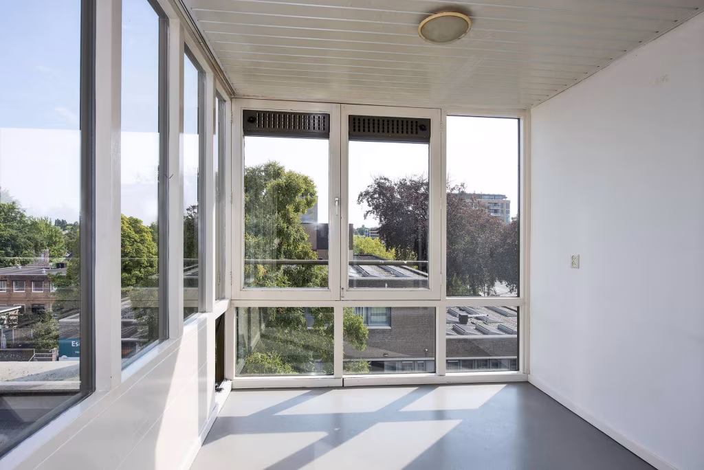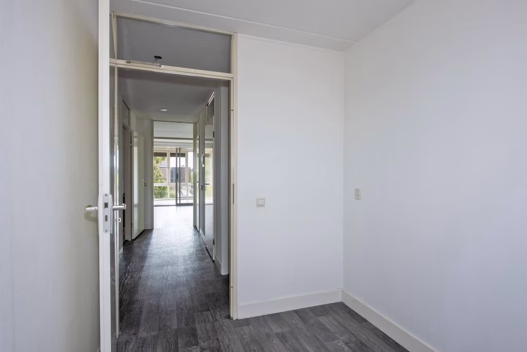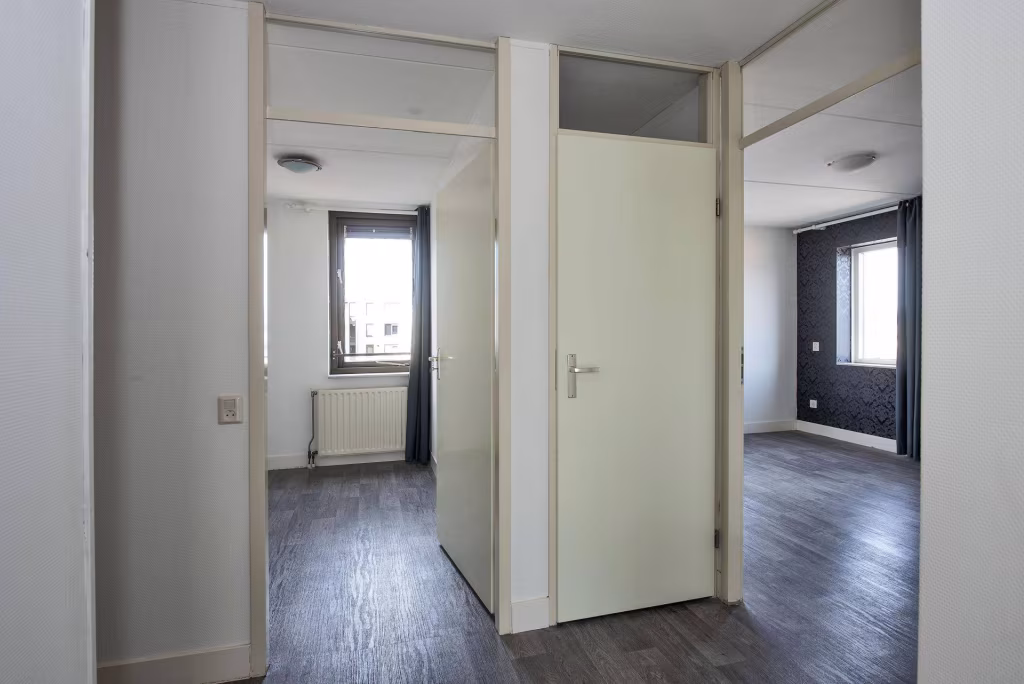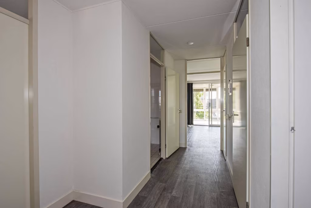 Entree/hal met meterkast, toilet en toegang tot alle vertrekken. Lichte woonkamer met grote raampartijen en vrij uitzicht, met aansluitend een serre op het westen. Halfopen keuken met elektrisch kooktoestel, vaatwasser, koelkast en vriezer. Twee slaapkamers van goed formaat, waarvan één ook geschikt is als werkkamer of hobbyruimte. Badkamer met wastafelmeubel, douche en wasmachineaansluiting.