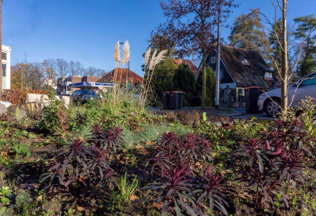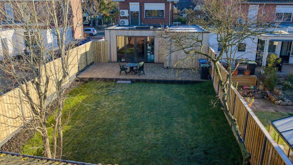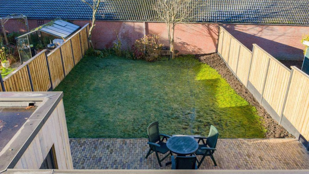 De achtertuin ligt op het westen en biedt veel privacy. Je hebt hier die fijne avondzon — precies wanneer je er het meest behoefte aan hebt.
