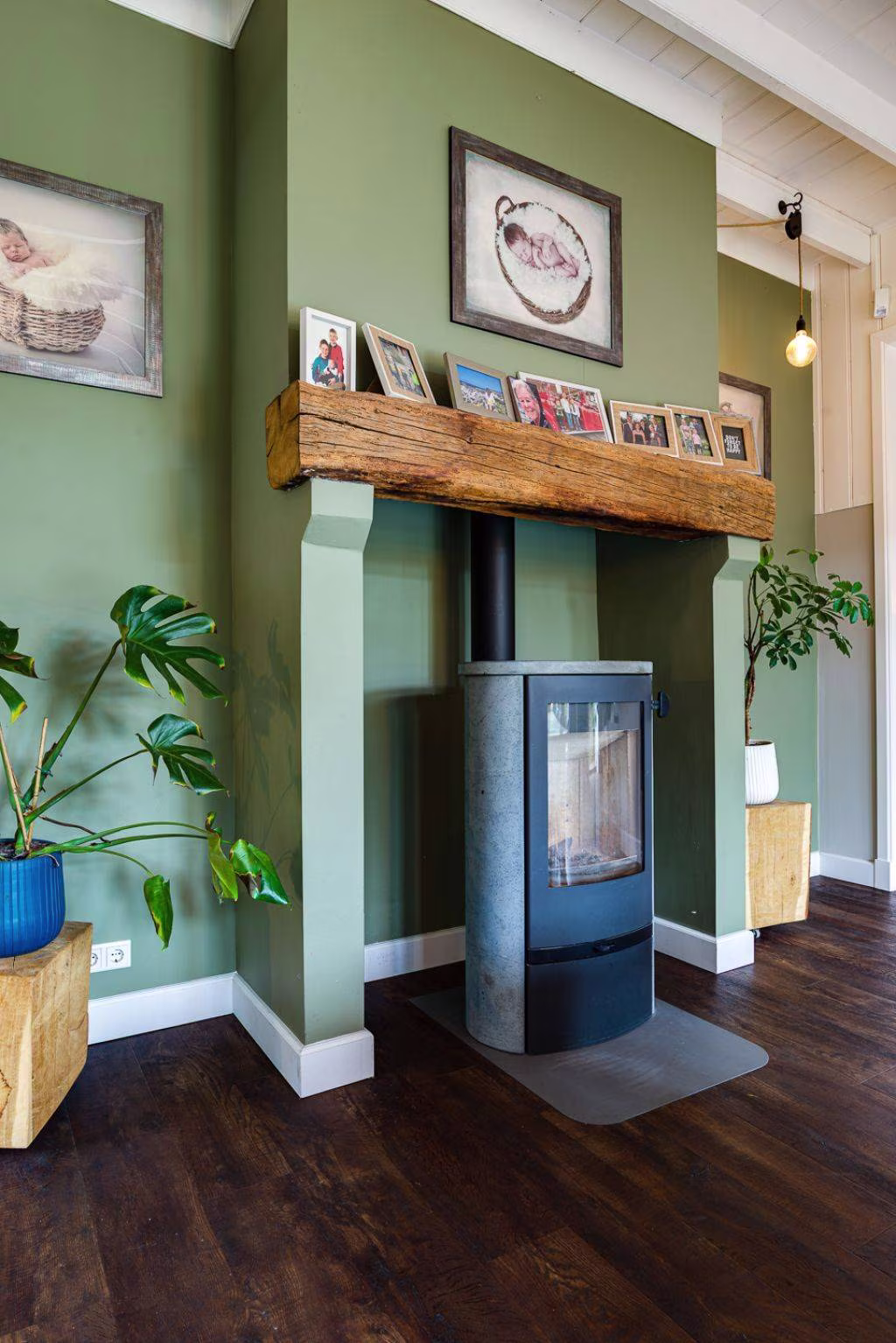 - De originele deel werd omgebouwd tot leefkamer, met open woonkeuken, zithoek en schouw met houtkachel.