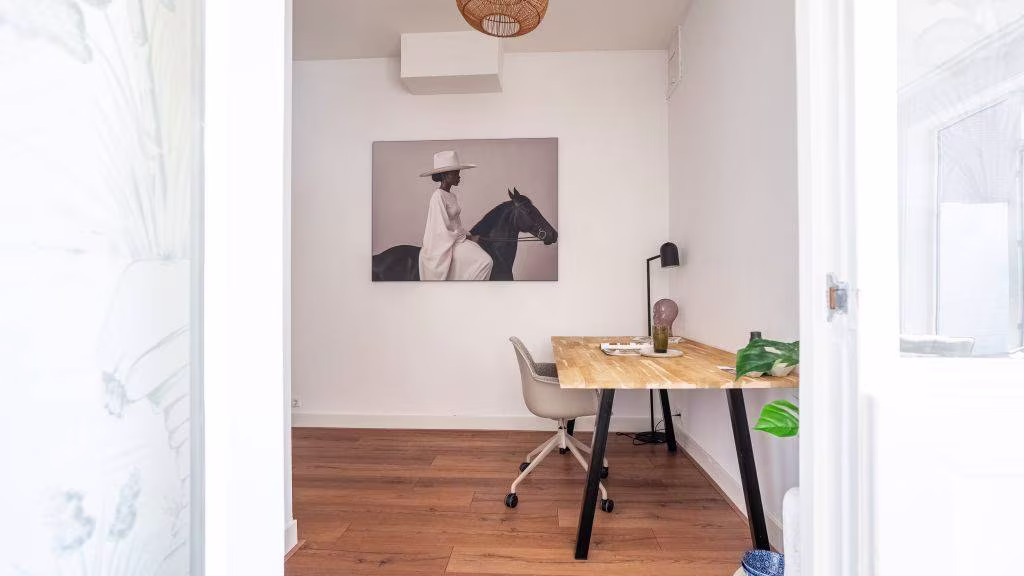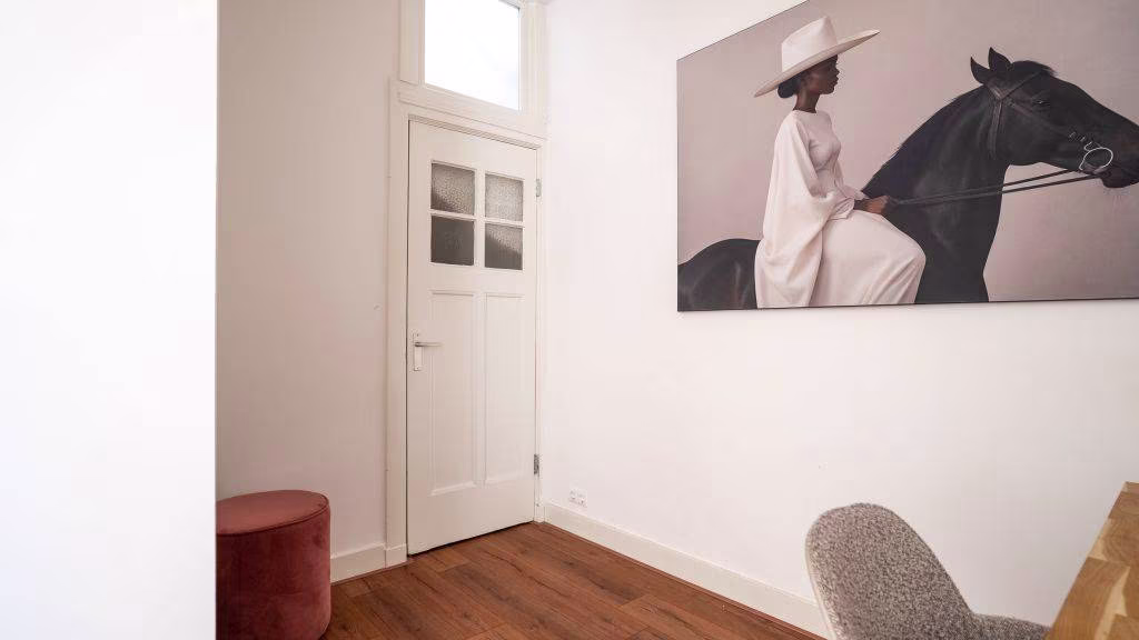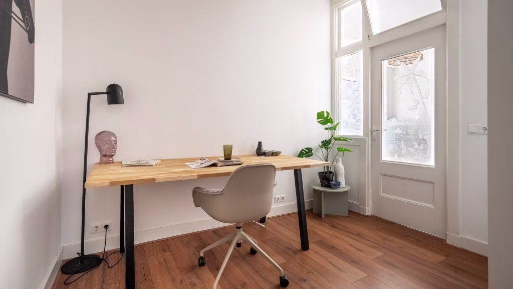 Het appartement beschikt over twee kamers. De ruime slaapkamer biedt voldoende plek voor een comfortabel bed en kastruimte. De tweede kamer is ideaal als werk- of studeerkamer en staat via een glazen deur in verbinding met de woonkamer, wat zorgt voor een open en ruimtelijk gevoel.