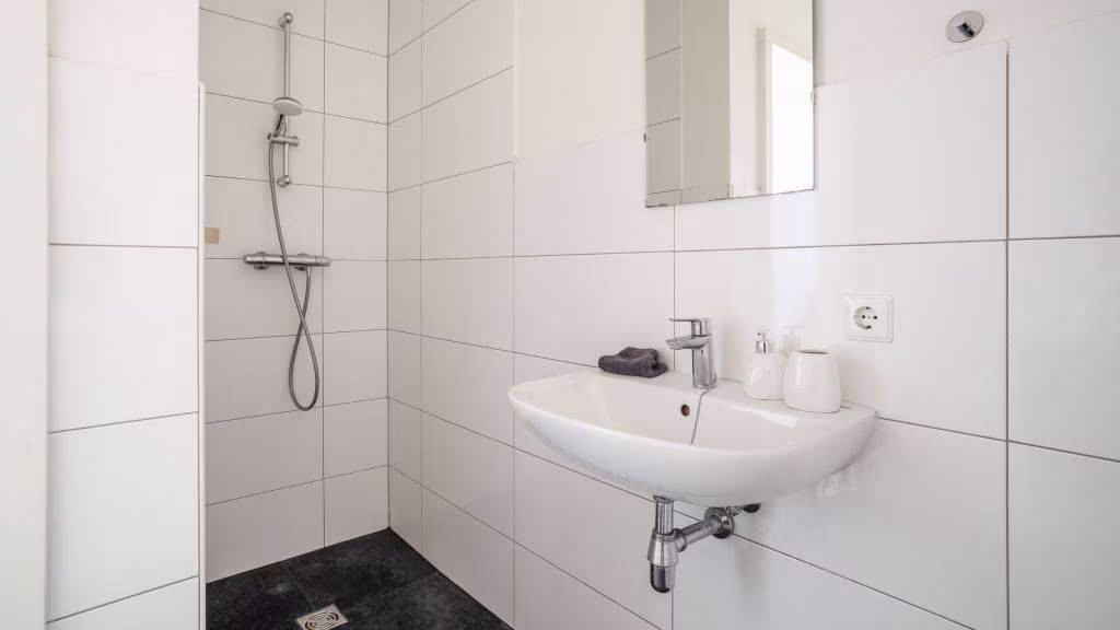 De badkamer is netjes en functioneel ingericht en voorzien van een douche en toilet.