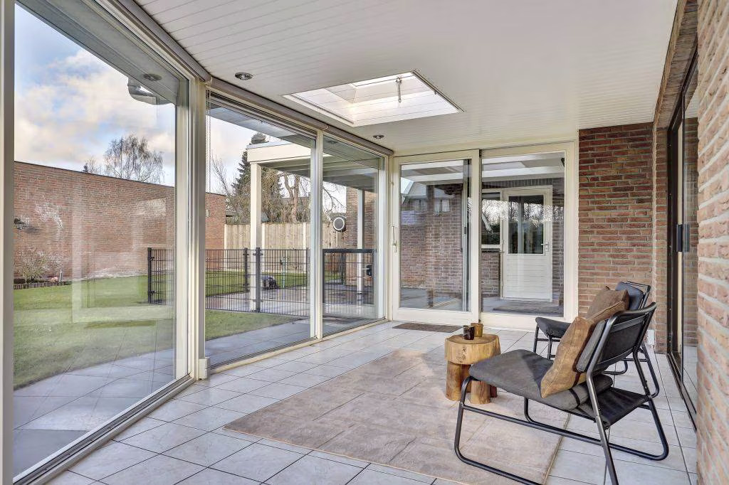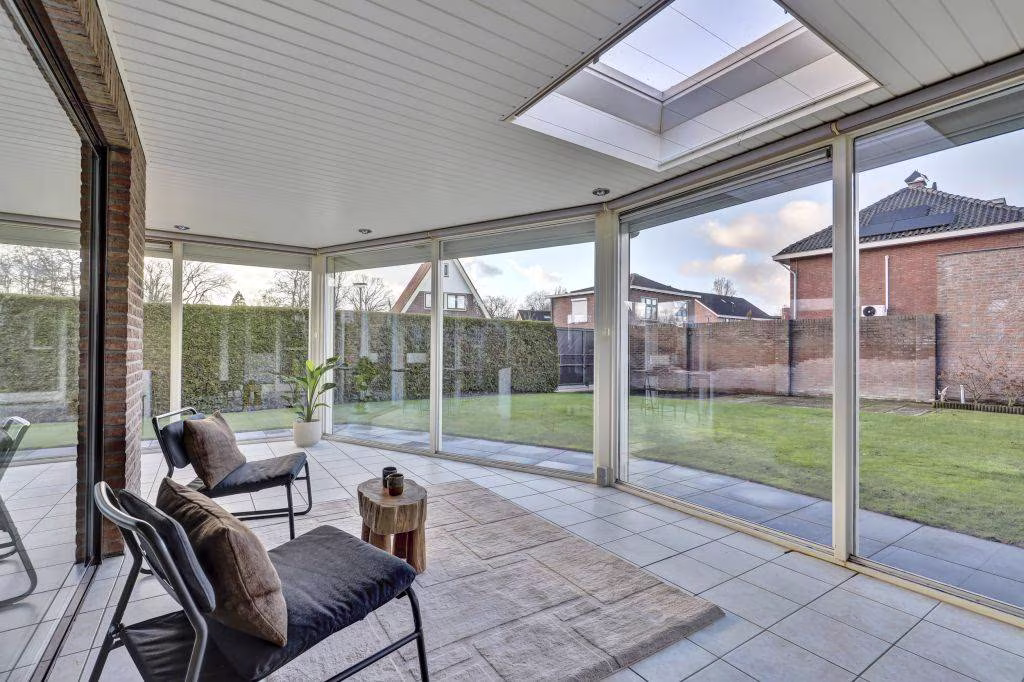 Aansluitend zijn zowel de garage/berging als de serre van ca. 20 m2 bereikbaar en deze is eveneens voorzien van vloerverwarming en airconditioning. Vanuit de schuifpui in de serre en vanuit de garage bereik je het grote overdekte terras, dat fijne schaduw geeft op zonnige dagen. De zonligging van de achtertuin is op het zuid-westen en door het gebruik van rolluiken en zonwering aan de buitenzijde van de woning is de binnentemperatuur op zonnige dagen toch acceptabel te houden.