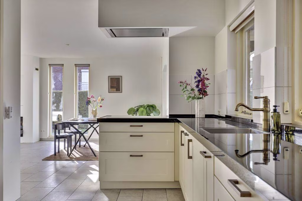 Fijne lichte woonkamer met vloertegels en vloerverwarming en gezellige sfeerhaard. Open keuken in een schiereiland opstelling en deze geeft daardoor leuke verbinding met de eet- en zitkamer. Het werkblad is uitgevoerd in graniet en de keuken is voorzien van veel kastruimte, laden en inbouwapparatuur.