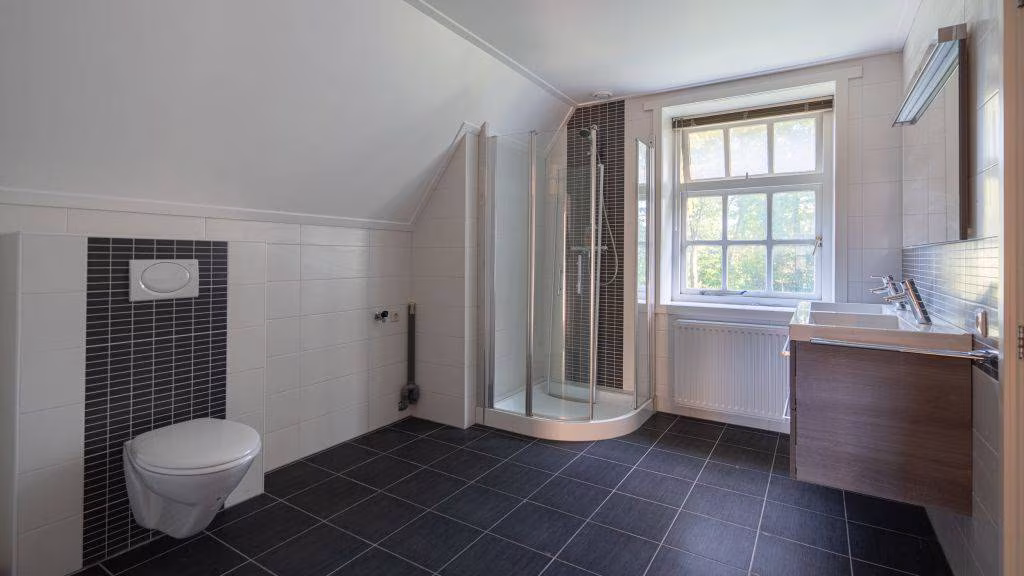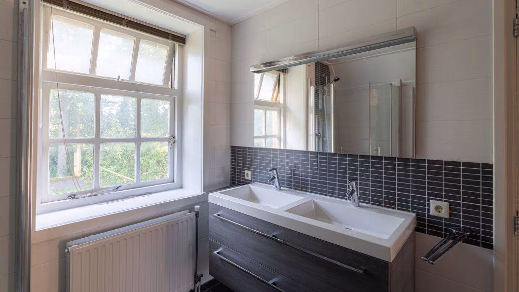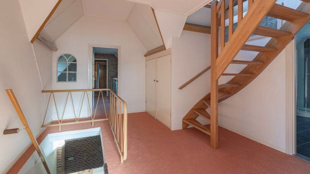 Overloop met vide, één zeer ruime slaapkamer, tweede slaapkamer en voorts de luxueuze badkamer. Vanaf de overloop bereik je aan de andere zijde van de woning nog twee slaapkamers en een badkamer die gemoderniseerd dienen te worden.